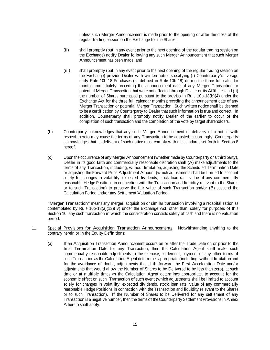 15 unless such Merger Announcement is made prior to the opening or after the close of the regular trading session on the Exchange for the Shares; (ii) shall promptly (but in any event prior to the next opening of the regular trading session on the Exchange) notify Dealer following any such Merger Announcement that such Merger Announcement has been made; and (iii) shall promptly (but in any event prior to the next opening of the regular trading session on the Exchange) provide Dealer with written notice specifying (i) Counterparty’s average daily Rule 10b-18 Purchases (as defined in Rule 10b-18) during the three full calendar months immediately preceding the announcement date of any Merger Transaction or potential Merger Transaction that were not effected through Dealer or its Affiliates and (ii) the number of Shares purchased pursuant to the proviso in Rule 10b-18(b)(4) under the Exchange Act for the three full calendar months preceding the announcement date of any Merger Transaction or potential Merger Transaction. Such written notice shall be deemed to be a certification by Counterparty to Dealer that such information is true and correct. In addition, Counterparty shall promptly notify Dealer of the earlier to occur of the completion of such transaction and the completion of the vote by target shareholders. (b) Counterparty acknowledges that any such Merger Announcement or delivery of a notice with respect thereto may cause the terms of any Transaction to be adjusted; accordingly, Counterparty acknowledges that its delivery of such notice must comply with the standards set forth in Section 8 hereof. (c) Upon the occurrence of any Merger Announcement (whether made by Counterparty or a third party), Dealer in its good faith and commercially reasonable discretion shall (A) make adjustments to the terms of any Transaction, including, without limitation, adjusting the Scheduled Termination Date or adjusting the Forward Price Adjustment Amount (which adjustments shall be limited to account solely for changes in volatility, expected dividends, stock loan rate, value of any commercially reasonable Hedge Positions in connection with the Transaction and liquidity relevant to the Shares or to such Transaction) to preserve the fair value of such Transaction and/or (B) suspend the Calculation Period and/or any Settlement Valuation Period. “Merger Transaction” means any merger, acquisition or similar transaction involving a recapitalization as contemplated by Rule 10b-18(a)(13)(iv) under the Exchange Act, other than, solely for purposes of this Section 10, any such transaction in which the consideration consists solely of cash and there is no valuation period. 11. Special Provisions for Acquisition Transaction Announcements. Notwithstanding anything to the contrary herein or in the Equity Definitions: (a) If an Acquisition Transaction Announcement occurs on or after the Trade Date on or prior to the final Termination Date for any Transaction, then the Calculation Agent shall make such commercially reasonable adjustments to the exercise, settlement, payment or any other terms of such Transaction as the Calculation Agent determines appropriate (including, without limitation and for the avoidance of doubt, adjustments that shift forward the First Acceleration Date and/or adjustments that would allow the Number of Shares to be Delivered to be less than zero), at such time or at multiple times as the Calculation Agent determines appropriate, to account for the economic effect on such Transaction of such event (which adjustments shall be limited to account solely for changes in volatility, expected dividends, stock loan rate, value of any commercially reasonable Hedge Positions in connection with the Transaction and liquidity relevant to the Shares or to such Transaction). If the Number of Shares to be Delivered for any settlement of any Transaction is a negative number, then the terms of the Counterparty Settlement Provisions in Annex A hereto shall apply.