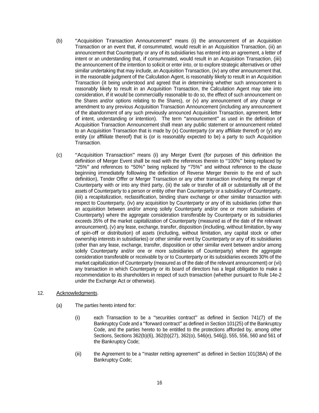 16 (b) “Acquisition Transaction Announcement” means (i) the announcement of an Acquisition Transaction or an event that, if consummated, would result in an Acquisition Transaction, (ii) an announcement that Counterparty or any of its subsidiaries has entered into an agreement, a letter of intent or an understanding that, if consummated, would result in an Acquisition Transaction, (iii) the announcement of the intention to solicit or enter into, or to explore strategic alternatives or other similar undertaking that may include, an Acquisition Transaction, (iv) any other announcement that, in the reasonable judgment of the Calculation Agent, is reasonably likely to result in an Acquisition Transaction (it being understood and agreed that in determining whether such announcement is reasonably likely to result in an Acquisition Transaction, the Calculation Agent may take into consideration, if it would be commercially reasonable to do so, the effect of such announcement on the Shares and/or options relating to the Shares), or (v) any announcement of any change or amendment to any previous Acquisition Transaction Announcement (including any announcement of the abandonment of any such previously announced Acquisition Transaction, agreement, letter of intent, understanding or intention). The term “announcement” as used in the definition of Acquisition Transaction Announcement shall mean any public statement or announcement related to an Acquisition Transaction that is made by (x) Counterparty (or any affiliate thereof) or (y) any entity (or affiliate thereof) that is (or is reasonably expected to be) a party to such Acquisition Transaction. (c) “Acquisition Transaction” means (i) any Merger Event (for purposes of this definition the definition of Merger Event shall be read with the references therein to “100%” being replaced by “25%” and references to “50%” being replaced by “75%” and without reference to the clause beginning immediately following the definition of Reverse Merger therein to the end of such definition), Tender Offer or Merger Transaction or any other transaction involving the merger of Counterparty with or into any third party, (ii) the sale or transfer of all or substantially all of the assets of Counterparty to a person or entity other than Counterparty or a subsidiary of Counterparty, (iii) a recapitalization, reclassification, binding share exchange or other similar transaction with respect to Counterparty, (iv) any acquisition by Counterparty or any of its subsidiaries (other than an acquisition between and/or among solely Counterparty and/or one or more subsidiaries of Counterparty) where the aggregate consideration transferable by Counterparty or its subsidiaries exceeds 35% of the market capitalization of Counterparty (measured as of the date of the relevant announcement), (v) any lease, exchange, transfer, disposition (including, without limitation, by way of spin-off or distribution) of assets (including, without limitation, any capital stock or other ownership interests in subsidiaries) or other similar event by Counterparty or any of its subsidiaries (other than any lease, exchange, transfer, disposition or other similar event between and/or among solely Counterparty and/or one or more subsidiaries of Counterparty) where the aggregate consideration transferable or receivable by or to Counterparty or its subsidiaries exceeds 30% of the market capitalization of Counterparty (measured as of the date of the relevant announcement) or (vi) any transaction in which Counterparty or its board of directors has a legal obligation to make a recommendation to its shareholders in respect of such transaction (whether pursuant to Rule 14e-2 under the Exchange Act or otherwise). 12. Acknowledgments. (a) The parties hereto intend for: (i) each Transaction to be a “securities contract” as defined in Section 741(7) of the Bankruptcy Code and a “forward contract” as defined in Section 101(25) of the Bankruptcy Code, and the parties hereto to be entitled to the protections afforded by, among other Sections, Sections 362(b)(6), 362(b)(27), 362(o), 546(e), 546(j), 555, 556, 560 and 561 of the Bankruptcy Code; (ii) the Agreement to be a “master netting agreement” as defined in Section 101(38A) of the Bankruptcy Code;