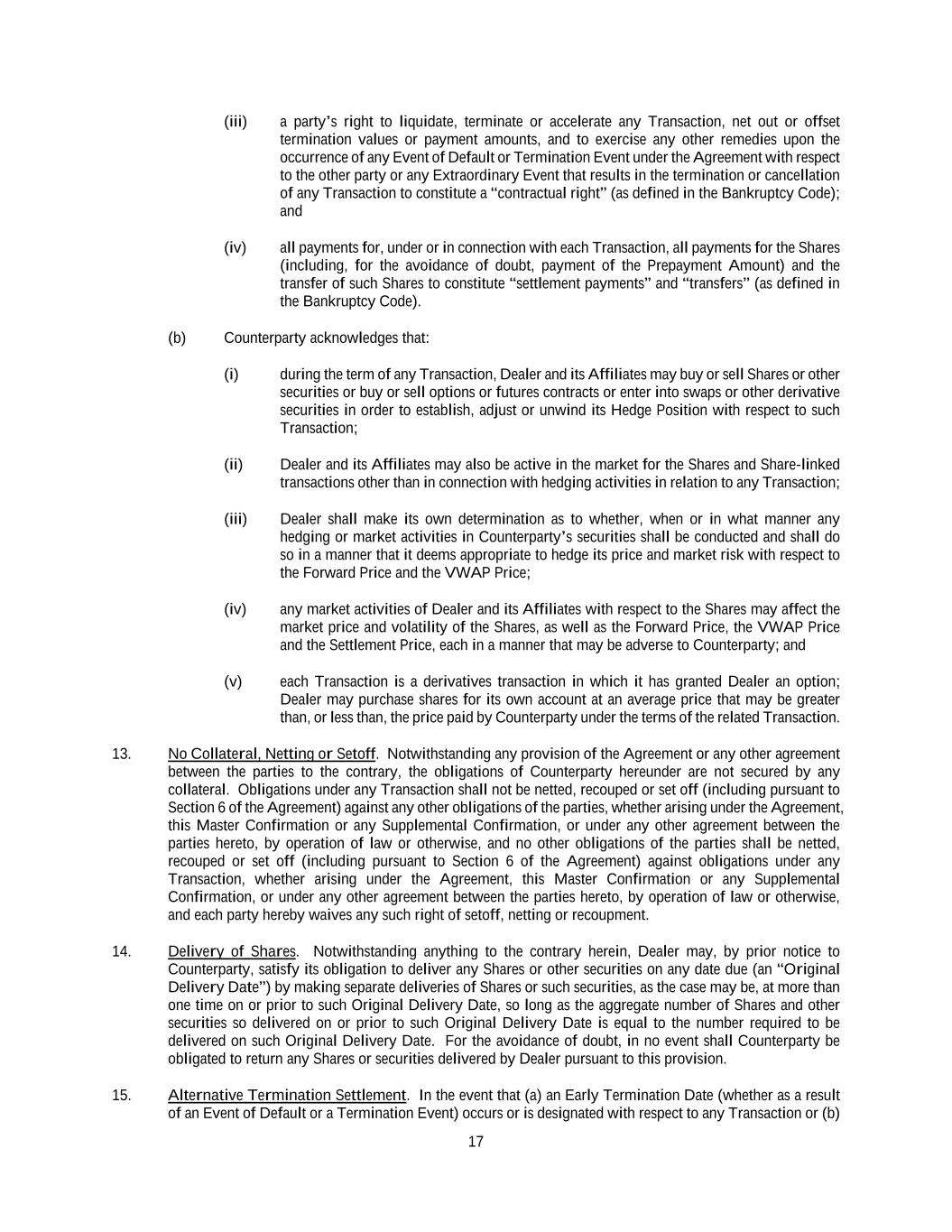 17 (iii) a party’s right to liquidate, terminate or accelerate any Transaction, net out or offset termination values or payment amounts, and to exercise any other remedies upon the occurrence of any Event of Default or Termination Event under the Agreement with respect to the other party or any Extraordinary Event that results in the termination or cancellation of any Transaction to constitute a “contractual right” (as defined in the Bankruptcy Code); and (iv) all payments for, under or in connection with each Transaction, all payments for the Shares (including, for the avoidance of doubt, payment of the Prepayment Amount) and the transfer of such Shares to constitute “settlement payments” and “transfers” (as defined in the Bankruptcy Code). (b) Counterparty acknowledges that: (i) during the term of any Transaction, Dealer and its Affiliates may buy or sell Shares or other securities or buy or sell options or futures contracts or enter into swaps or other derivative securities in order to establish, adjust or unwind its Hedge Position with respect to such Transaction; (ii) Dealer and its Affiliates may also be active in the market for the Shares and Share-linked transactions other than in connection with hedging activities in relation to any Transaction; (iii) Dealer shall make its own determination as to whether, when or in what manner any hedging or market activities in Counterparty’s securities shall be conducted and shall do so in a manner that it deems appropriate to hedge its price and market risk with respect to the Forward Price and the VWAP Price; (iv) any market activities of Dealer and its Affiliates with respect to the Shares may affect the market price and volatility of the Shares, as well as the Forward Price, the VWAP Price and the Settlement Price, each in a manner that may be adverse to Counterparty; and (v) each Transaction is a derivatives transaction in which it has granted Dealer an option; Dealer may purchase shares for its own account at an average price that may be greater than, or less than, the price paid by Counterparty under the terms of the related Transaction. 13. No Collateral, Netting or Setoff. Notwithstanding any provision of the Agreement or any other agreement between the parties to the contrary, the obligations of Counterparty hereunder are not secured by any collateral. Obligations under any Transaction shall not be netted, recouped or set off (including pursuant to Section 6 of the Agreement) against any other obligations of the parties, whether arising under the Agreement, this Master Confirmation or any Supplemental Confirmation, or under any other agreement between the parties hereto, by operation of law or otherwise, and no other obligations of the parties shall be netted, recouped or set off (including pursuant to Section 6 of the Agreement) against obligations under any Transaction, whether arising under the Agreement, this Master Confirmation or any Supplemental Confirmation, or under any other agreement between the parties hereto, by operation of law or otherwise, and each party hereby waives any such right of setoff, netting or recoupment. 14. Delivery of Shares. Notwithstanding anything to the contrary herein, Dealer may, by prior notice to Counterparty, satisfy its obligation to deliver any Shares or other securities on any date due (an “Original Delivery Date”) by making separate deliveries of Shares or such securities, as the case may be, at more than one time on or prior to such Original Delivery Date, so long as the aggregate number of Shares and other securities so delivered on or prior to such Original Delivery Date is equal to the number required to be delivered on such Original Delivery Date. For the avoidance of doubt, in no event shall Counterparty be obligated to return any Shares or securities delivered by Dealer pursuant to this provision. 15. Alternative Termination Settlement. In the event that (a) an Early Termination Date (whether as a result of an Event of Default or a Termination Event) occurs or is designated with respect to any Transaction or (b)