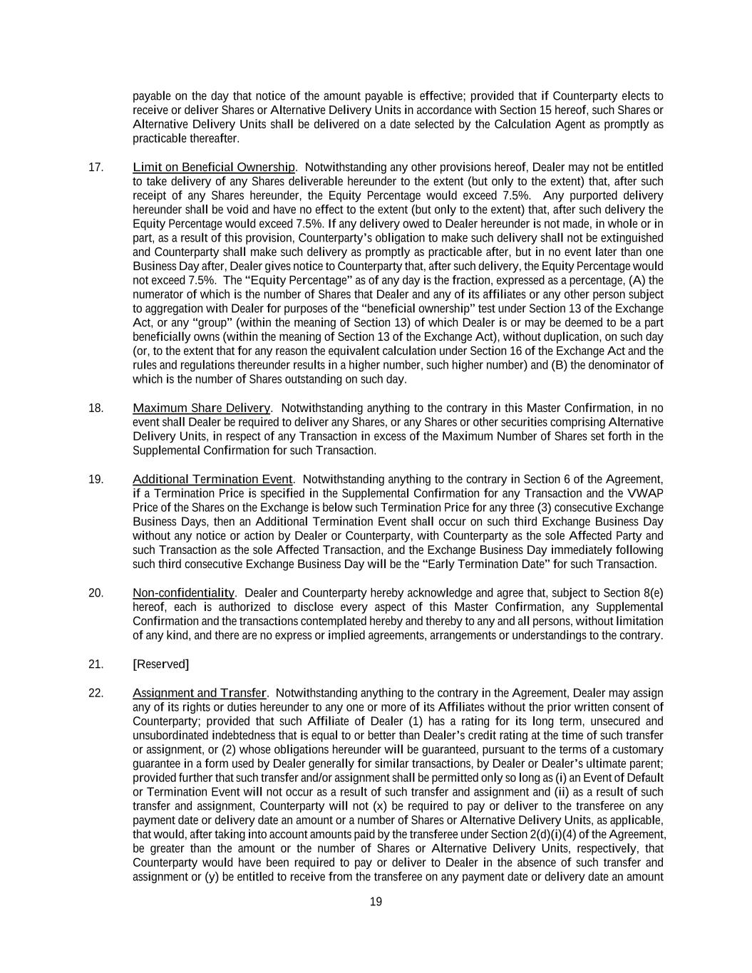 19 payable on the day that notice of the amount payable is effective; provided that if Counterparty elects to receive or deliver Shares or Alternative Delivery Units in accordance with Section 15 hereof, such Shares or Alternative Delivery Units shall be delivered on a date selected by the Calculation Agent as promptly as practicable thereafter. 17. Limit on Beneficial Ownership. Notwithstanding any other provisions hereof, Dealer may not be entitled to take delivery of any Shares deliverable hereunder to the extent (but only to the extent) that, after such receipt of any Shares hereunder, the Equity Percentage would exceed 7.5%. Any purported delivery hereunder shall be void and have no effect to the extent (but only to the extent) that, after such delivery the Equity Percentage would exceed 7.5%. If any delivery owed to Dealer hereunder is not made, in whole or in part, as a result of this provision, Counterparty’s obligation to make such delivery shall not be extinguished and Counterparty shall make such delivery as promptly as practicable after, but in no event later than one Business Day after, Dealer gives notice to Counterparty that, after such delivery, the Equity Percentage would not exceed 7.5%. The “Equity Percentage” as of any day is the fraction, expressed as a percentage, (A) the numerator of which is the number of Shares that Dealer and any of its affiliates or any other person subject to aggregation with Dealer for purposes of the “beneficial ownership” test under Section 13 of the Exchange Act, or any “group” (within the meaning of Section 13) of which Dealer is or may be deemed to be a part beneficially owns (within the meaning of Section 13 of the Exchange Act), without duplication, on such day (or, to the extent that for any reason the equivalent calculation under Section 16 of the Exchange Act and the rules and regulations thereunder results in a higher number, such higher number) and (B) the denominator of which is the number of Shares outstanding on such day. 18. Maximum Share Delivery. Notwithstanding anything to the contrary in this Master Confirmation, in no event shall Dealer be required to deliver any Shares, or any Shares or other securities comprising Alternative Delivery Units, in respect of any Transaction in excess of the Maximum Number of Shares set forth in the Supplemental Confirmation for such Transaction. 19. Additional Termination Event. Notwithstanding anything to the contrary in Section 6 of the Agreement, if a Termination Price is specified in the Supplemental Confirmation for any Transaction and the VWAP Price of the Shares on the Exchange is below such Termination Price for any three (3) consecutive Exchange Business Days, then an Additional Termination Event shall occur on such third Exchange Business Day without any notice or action by Dealer or Counterparty, with Counterparty as the sole Affected Party and such Transaction as the sole Affected Transaction, and the Exchange Business Day immediately following such third consecutive Exchange Business Day will be the “Early Termination Date” for such Transaction. 20. Non-confidentiality. Dealer and Counterparty hereby acknowledge and agree that, subject to Section 8(e) hereof, each is authorized to disclose every aspect of this Master Confirmation, any Supplemental Confirmation and the transactions contemplated hereby and thereby to any and all persons, without limitation of any kind, and there are no express or implied agreements, arrangements or understandings to the contrary. 21. [Reserved] 22. Assignment and Transfer. Notwithstanding anything to the contrary in the Agreement, Dealer may assign any of its rights or duties hereunder to any one or more of its Affiliates without the prior written consent of Counterparty; provided that such Affiliate of Dealer (1) has a rating for its long term, unsecured and unsubordinated indebtedness that is equal to or better than Dealer’s credit rating at the time of such transfer or assignment, or (2) whose obligations hereunder will be guaranteed, pursuant to the terms of a customary guarantee in a form used by Dealer generally for similar transactions, by Dealer or Dealer’s ultimate parent; provided further that such transfer and/or assignment shall be permitted only so long as (i) an Event of Default or Termination Event will not occur as a result of such transfer and assignment and (ii) as a result of such transfer and assignment, Counterparty will not (x) be required to pay or deliver to the transferee on any payment date or delivery date an amount or a number of Shares or Alternative Delivery Units, as applicable, that would, after taking into account amounts paid by the transferee under Section 2(d)(i)(4) of the Agreement, be greater than the amount or the number of Shares or Alternative Delivery Units, respectively, that Counterparty would have been required to pay or deliver to Dealer in the absence of such transfer and assignment or (y) be entitled to receive from the transferee on any payment date or delivery date an amount
