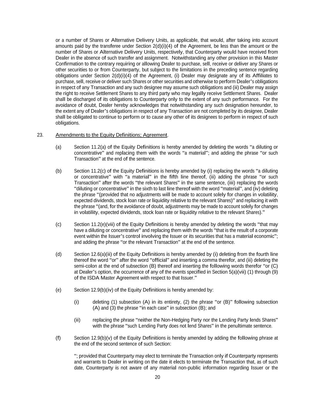 20 or a number of Shares or Alternative Delivery Units, as applicable, that would, after taking into account amounts paid by the transferee under Section 2(d)(i)(4) of the Agreement, be less than the amount or the number of Shares or Alternative Delivery Units, respectively, that Counterparty would have received from Dealer in the absence of such transfer and assignment. Notwithstanding any other provision in this Master Confirmation to the contrary requiring or allowing Dealer to purchase, sell, receive or deliver any Shares or other securities to or from Counterparty, but subject to the limitations in the preceding sentence regarding obligations under Section 2(d)(i)(4) of the Agreement, (i) Dealer may designate any of its Affiliates to purchase, sell, receive or deliver such Shares or other securities and otherwise to perform Dealer’s obligations in respect of any Transaction and any such designee may assume such obligations and (ii) Dealer may assign the right to receive Settlement Shares to any third party who may legally receive Settlement Shares. Dealer shall be discharged of its obligations to Counterparty only to the extent of any such performance. For the avoidance of doubt, Dealer hereby acknowledges that notwithstanding any such designation hereunder, to the extent any of Dealer’s obligations in respect of any Transaction are not completed by its designee, Dealer shall be obligated to continue to perform or to cause any other of its designees to perform in respect of such obligations. 23. Amendments to the Equity Definitions; Agreement. (a) Section 11.2(a) of the Equity Definitions is hereby amended by deleting the words “a diluting or concentrative” and replacing them with the words “a material”; and adding the phrase “or such Transaction” at the end of the sentence. (b) Section 11.2(c) of the Equity Definitions is hereby amended by (i) replacing the words “a diluting or concentrative” with “a material” in the fifth line thereof, (ii) adding the phrase “or such Transaction” after the words “the relevant Shares” in the same sentence, (iii) replacing the words “diluting or concentrative” in the sixth to last line thereof with the word “material”, and (iv) deleting the phrase “(provided that no adjustments will be made to account solely for changes in volatility, expected dividends, stock loan rate or liquidity relative to the relevant Shares)” and replacing it with the phrase “(and, for the avoidance of doubt, adjustments may be made to account solely for changes in volatility, expected dividends, stock loan rate or liquidity relative to the relevant Shares).” (c) Section 11.2(e)(vii) of the Equity Definitions is hereby amended by deleting the words “that may have a diluting or concentrative” and replacing them with the words “that is the result of a corporate event within the Issuer’s control involving the Issuer or its securities that has a material economic”; and adding the phrase “or the relevant Transaction” at the end of the sentence. (d) Section 12.6(a)(ii) of the Equity Definitions is hereby amended by (i) deleting from the fourth line thereof the word “or” after the word “official” and inserting a comma therefor, and (ii) deleting the semi-colon at the end of subsection (B) thereof and inserting the following words therefor “or (C) at Dealer’s option, the occurrence of any of the events specified in Section 5(a)(vii) (1) through (9) of the ISDA Master Agreement with respect to that Issuer.” (e) Section 12.9(b)(iv) of the Equity Definitions is hereby amended by: (i) deleting (1) subsection (A) in its entirety, (2) the phrase “or (B)” following subsection (A) and (3) the phrase “in each case” in subsection (B); and (ii) replacing the phrase “neither the Non-Hedging Party nor the Lending Party lends Shares” with the phrase “such Lending Party does not lend Shares” in the penultimate sentence. (f) Section 12.9(b)(v) of the Equity Definitions is hereby amended by adding the following phrase at the end of the second sentence of such Section: “; provided that Counterparty may elect to terminate the Transaction only if Counterparty represents and warrants to Dealer in writing on the date it elects to terminate the Transaction that, as of such date, Counterparty is not aware of any material non-public information regarding Issuer or the