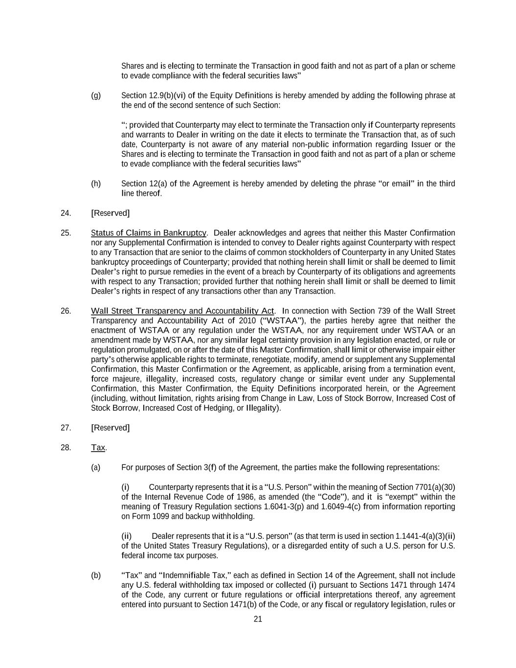 21 Shares and is electing to terminate the Transaction in good faith and not as part of a plan or scheme to evade compliance with the federal securities laws” (g) Section 12.9(b)(vi) of the Equity Definitions is hereby amended by adding the following phrase at the end of the second sentence of such Section: “; provided that Counterparty may elect to terminate the Transaction only if Counterparty represents and warrants to Dealer in writing on the date it elects to terminate the Transaction that, as of such date, Counterparty is not aware of any material non-public information regarding Issuer or the Shares and is electing to terminate the Transaction in good faith and not as part of a plan or scheme to evade compliance with the federal securities laws” (h) Section 12(a) of the Agreement is hereby amended by deleting the phrase “or email” in the third line thereof. 24. [Reserved] 25. Status of Claims in Bankruptcy. Dealer acknowledges and agrees that neither this Master Confirmation nor any Supplemental Confirmation is intended to convey to Dealer rights against Counterparty with respect to any Transaction that are senior to the claims of common stockholders of Counterparty in any United States bankruptcy proceedings of Counterparty; provided that nothing herein shall limit or shall be deemed to limit Dealer’s right to pursue remedies in the event of a breach by Counterparty of its obligations and agreements with respect to any Transaction; provided further that nothing herein shall limit or shall be deemed to limit Dealer’s rights in respect of any transactions other than any Transaction. 26. Wall Street Transparency and Accountability Act. In connection with Section 739 of the Wall Street Transparency and Accountability Act of 2010 (“WSTAA”), the parties hereby agree that neither the enactment of WSTAA or any regulation under the WSTAA, nor any requirement under WSTAA or an amendment made by WSTAA, nor any similar legal certainty provision in any legislation enacted, or rule or regulation promulgated, on or after the date of this Master Confirmation, shall limit or otherwise impair either party’s otherwise applicable rights to terminate, renegotiate, modify, amend or supplement any Supplemental Confirmation, this Master Confirmation or the Agreement, as applicable, arising from a termination event, force majeure, illegality, increased costs, regulatory change or similar event under any Supplemental Confirmation, this Master Confirmation, the Equity Definitions incorporated herein, or the Agreement (including, without limitation, rights arising from Change in Law, Loss of Stock Borrow, Increased Cost of Stock Borrow, Increased Cost of Hedging, or Illegality). 27. [Reserved] 28. Tax. (a) For purposes of Section 3(f) of the Agreement, the parties make the following representations: (i) Counterparty represents that it is a “U.S. Person” within the meaning of Section 7701(a)(30) of the Internal Revenue Code of 1986, as amended (the “Code”), and it is “exempt” within the meaning of Treasury Regulation sections 1.6041-3(p) and 1.6049-4(c) from information reporting on Form 1099 and backup withholding. (ii) Dealer represents that it is a “U.S. person” (as that term is used in section 1.1441-4(a)(3)(ii) of the United States Treasury Regulations), or a disregarded entity of such a U.S. person for U.S. federal income tax purposes. (b) “Tax” and “Indemnifiable Tax,” each as defined in Section 14 of the Agreement, shall not include any U.S. federal withholding tax imposed or collected (i) pursuant to Sections 1471 through 1474 of the Code, any current or future regulations or official interpretations thereof, any agreement entered into pursuant to Section 1471(b) of the Code, or any fiscal or regulatory legislation, rules or
