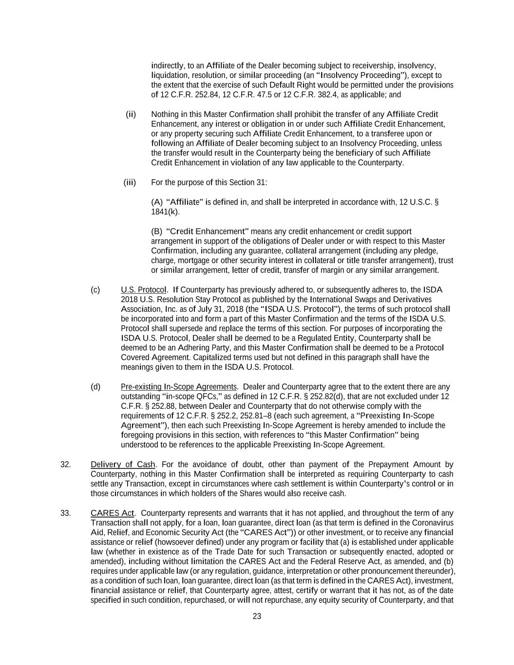 23 indirectly, to an Affiliate of the Dealer becoming subject to receivership, insolvency, liquidation, resolution, or similar proceeding (an “Insolvency Proceeding”), except to the extent that the exercise of such Default Right would be permitted under the provisions of 12 C.F.R. 252.84, 12 C.F.R. 47.5 or 12 C.F.R. 382.4, as applicable; and (ii) Nothing in this Master Confirmation shall prohibit the transfer of any Affiliate Credit Enhancement, any interest or obligation in or under such Affiliate Credit Enhancement, or any property securing such Affiliate Credit Enhancement, to a transferee upon or following an Affiliate of Dealer becoming subject to an Insolvency Proceeding, unless the transfer would result in the Counterparty being the beneficiary of such Affiliate Credit Enhancement in violation of any law applicable to the Counterparty. (iii) For the purpose of this Section 31: (A) “Affiliate” is defined in, and shall be interpreted in accordance with, 12 U.S.C. § 1841(k). (B) “Credit Enhancement” means any credit enhancement or credit support arrangement in support of the obligations of Dealer under or with respect to this Master Confirmation, including any guarantee, collateral arrangement (including any pledge, charge, mortgage or other security interest in collateral or title transfer arrangement), trust or similar arrangement, letter of credit, transfer of margin or any similar arrangement. (c) U.S. Protocol. If Counterparty has previously adhered to, or subsequently adheres to, the ISDA 2018 U.S. Resolution Stay Protocol as published by the International Swaps and Derivatives Association, Inc. as of July 31, 2018 (the “ISDA U.S. Protocol”), the terms of such protocol shall be incorporated into and form a part of this Master Confirmation and the terms of the ISDA U.S. Protocol shall supersede and replace the terms of this section. For purposes of incorporating the ISDA U.S. Protocol, Dealer shall be deemed to be a Regulated Entity, Counterparty shall be deemed to be an Adhering Party, and this Master Confirmation shall be deemed to be a Protocol Covered Agreement. Capitalized terms used but not defined in this paragraph shall have the meanings given to them in the ISDA U.S. Protocol. (d) Pre-existing In-Scope Agreements. Dealer and Counterparty agree that to the extent there are any outstanding “in-scope QFCs,” as defined in 12 C.F.R. § 252.82(d), that are not excluded under 12 C.F.R. § 252.88, between Dealer and Counterparty that do not otherwise comply with the requirements of 12 C.F.R. § 252.2, 252.81–8 (each such agreement, a “Preexisting In-Scope Agreement”), then each such Preexisting In-Scope Agreement is hereby amended to include the foregoing provisions in this section, with references to “this Master Confirmation” being understood to be references to the applicable Preexisting In-Scope Agreement. 32. Delivery of Cash. For the avoidance of doubt, other than payment of the Prepayment Amount by Counterparty, nothing in this Master Confirmation shall be interpreted as requiring Counterparty to cash settle any Transaction, except in circumstances where cash settlement is within Counterparty’s control or in those circumstances in which holders of the Shares would also receive cash. 33. CARES Act. Counterparty represents and warrants that it has not applied, and throughout the term of any Transaction shall not apply, for a loan, loan guarantee, direct loan (as that term is defined in the Coronavirus Aid, Relief, and Economic Security Act (the “CARES Act”)) or other investment, or to receive any financial assistance or relief (howsoever defined) under any program or facility that (a) is established under applicable law (whether in existence as of the Trade Date for such Transaction or subsequently enacted, adopted or amended), including without limitation the CARES Act and the Federal Reserve Act, as amended, and (b) requires under applicable law (or any regulation, guidance, interpretation or other pronouncement thereunder), as a condition of such loan, loan guarantee, direct loan (as that term is defined in the CARES Act), investment, financial assistance or relief, that Counterparty agree, attest, certify or warrant that it has not, as of the date specified in such condition, repurchased, or will not repurchase, any equity security of Counterparty, and that