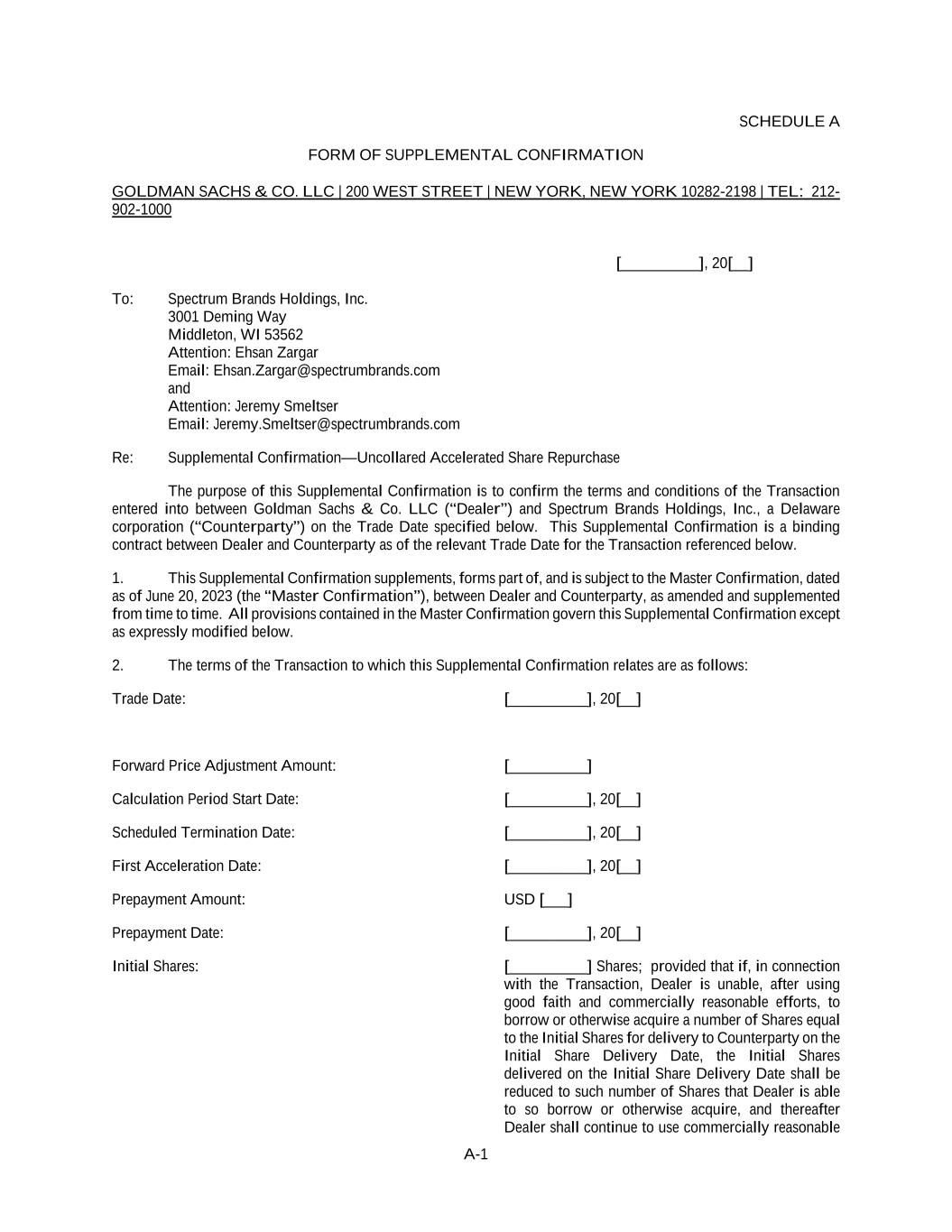 A-1 SCHEDULE A FORM OF SUPPLEMENTAL CONFIRMATION GOLDMAN SACHS & CO. LLC | 200 WEST STREET | NEW YORK, NEW YORK 10282-2198 | TEL: 212- 902-1000 [__________], 20[__] To: Spectrum Brands Holdings, Inc. 3001 Deming Way Middleton, WI 53562 Attention: Ehsan Zargar Email: Ehsan.Zargar@spectrumbrands.com and Attention: Jeremy Smeltser Email: Jeremy.Smeltser@spectrumbrands.com Re: Supplemental Confirmation—Uncollared Accelerated Share Repurchase The purpose of this Supplemental Confirmation is to confirm the terms and conditions of the Transaction entered into between Goldman Sachs & Co. LLC (“Dealer”) and Spectrum Brands Holdings, Inc., a Delaware corporation (“Counterparty”) on the Trade Date specified below. This Supplemental Confirmation is a binding contract between Dealer and Counterparty as of the relevant Trade Date for the Transaction referenced below. 1. This Supplemental Confirmation supplements, forms part of, and is subject to the Master Confirmation, dated as of June 20, 2023 (the “Master Confirmation”), between Dealer and Counterparty, as amended and supplemented from time to time. All provisions contained in the Master Confirmation govern this Supplemental Confirmation except as expressly modified below. 2. The terms of the Transaction to which this Supplemental Confirmation relates are as follows: Trade Date: [__________], 20[__] Forward Price Adjustment Amount: [__________] Calculation Period Start Date: [__________], 20[__] Scheduled Termination Date: [__________], 20[__] First Acceleration Date: [__________], 20[__] Prepayment Amount: USD [___] Prepayment Date: [__________], 20[__] Initial Shares: [__________] Shares; provided that if, in connection with the Transaction, Dealer is unable, after using good faith and commercially reasonable efforts, to borrow or otherwise acquire a number of Shares equal to the Initial Shares for delivery to Counterparty on the Initial Share Delivery Date, the Initial Shares delivered on the Initial Share Delivery Date shall be reduced to such number of Shares that Dealer is able to so borrow or otherwise acquire, and thereafter Dealer shall continue to use commercially reasonable