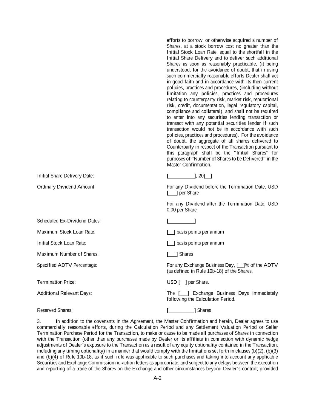 A-2 efforts to borrow, or otherwise acquired a number of Shares, at a stock borrow cost no greater than the Initial Stock Loan Rate, equal to the shortfall in the Initial Share Delivery and to deliver such additional Shares as soon as reasonably practicable, (it being understood, for the avoidance of doubt, that in using such commercially reasonable efforts Dealer shall act in good faith and in accordance with its then current policies, practices and procedures, (including without limitation any policies, practices and procedures relating to counterparty risk, market risk, reputational risk, credit, documentation, legal regulatory capital, compliance and collateral), and shall not be required to enter into any securities lending transaction or transact with any potential securities lender if such transaction would not be in accordance with such policies, practices and procedures). For the avoidance of doubt, the aggregate of all shares delivered to Counterparty in respect of the Transaction pursuant to this paragraph shall be the “Initial Shares” for purposes of “Number of Shares to be Delivered” in the Master Confirmation. Initial Share Delivery Date: [__________], 20[__] Ordinary Dividend Amount: For any Dividend before the Termination Date, USD [___] per Share For any Dividend after the Termination Date, USD 0.00 per Share Scheduled Ex-Dividend Dates: [__________] Maximum Stock Loan Rate: [__] basis points per annum Initial Stock Loan Rate: [__] basis points per annum Maximum Number of Shares: [___] Shares Specified ADTV Percentage: For any Exchange Business Day, [__]% of the ADTV (as defined in Rule 10b-18) of the Shares. Termination Price: USD [ ] per Share. Additional Relevant Days: The [___] Exchange Business Days immediately following the Calculation Period. Reserved Shares: [__________] Shares 3. In addition to the covenants in the Agreement, the Master Confirmation and herein, Dealer agrees to use commercially reasonable efforts, during the Calculation Period and any Settlement Valuation Period or Seller Termination Purchase Period for the Transaction, to make or cause to be made all purchases of Shares in connection with the Transaction (other than any purchases made by Dealer or its affiliate in connection with dynamic hedge adjustments of Dealer’s exposure to the Transaction as a result of any equity optionality contained in the Transaction, including any timing optionality) in a manner that would comply with the limitations set forth in clauses (b)(2), (b)(3) and (b)(4) of Rule 10b-18, as if such rule was applicable to such purchases and taking into account any applicable Securities and Exchange Commission no-action letters as appropriate, and subject to any delays between the execution and reporting of a trade of the Shares on the Exchange and other circumstances beyond Dealer’s control; provided