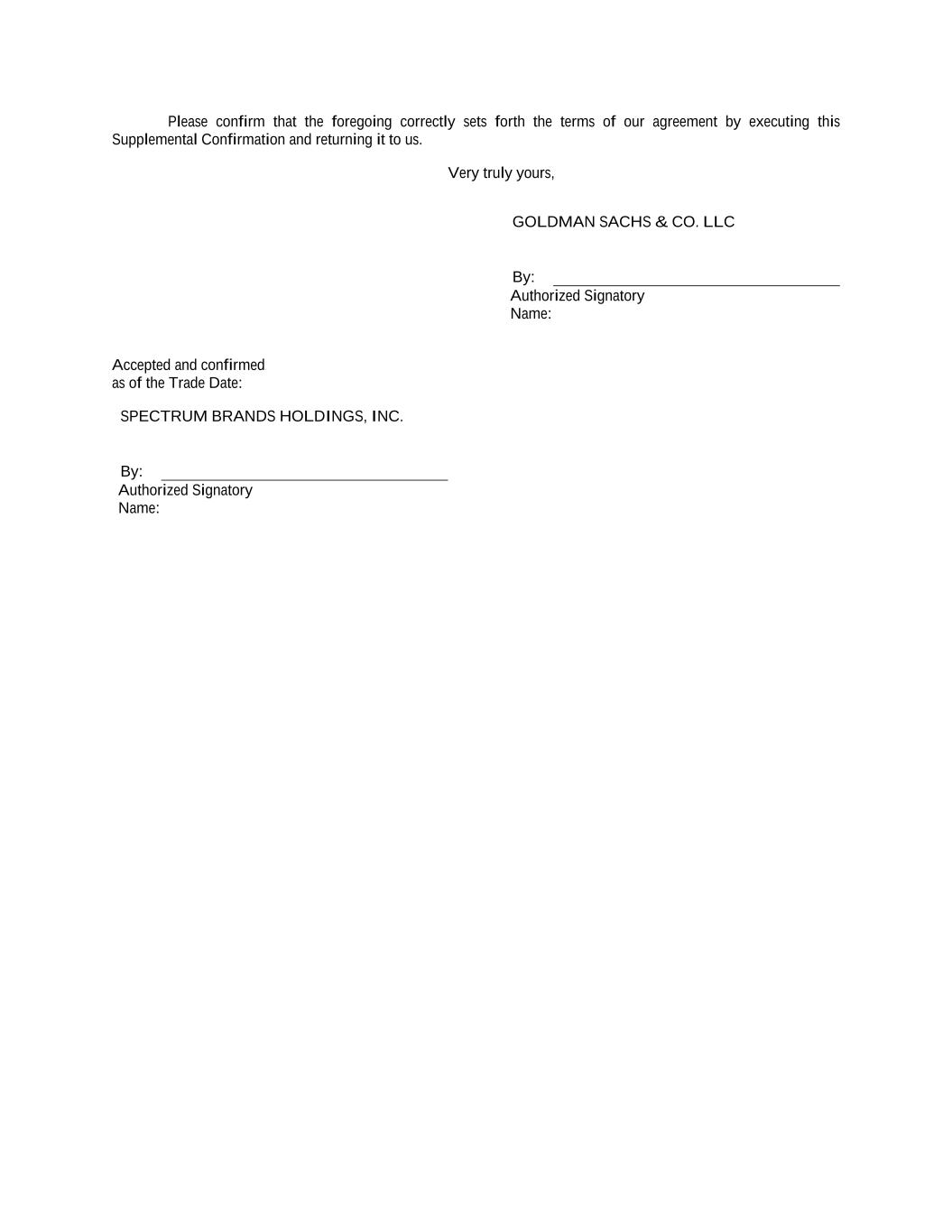 Please confirm that the foregoing correctly sets forth the terms of our agreement by executing this Supplemental Confirmation and returning it to us. Very truly yours, GOLDMAN SACHS & CO. LLC By: Authorized Signatory Name: Accepted and confirmed as of the Trade Date: SPECTRUM BRANDS HOLDINGS, INC. By: Authorized Signatory Name: