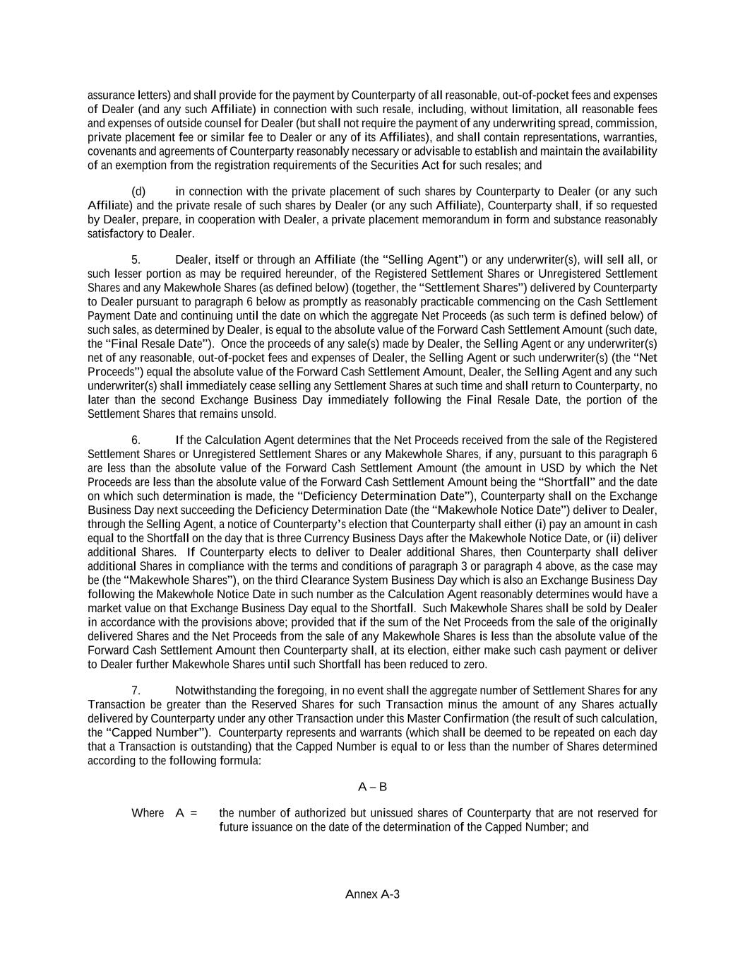 Annex A-3 assurance letters) and shall provide for the payment by Counterparty of all reasonable, out-of-pocket fees and expenses of Dealer (and any such Affiliate) in connection with such resale, including, without limitation, all reasonable fees and expenses of outside counsel for Dealer (but shall not require the payment of any underwriting spread, commission, private placement fee or similar fee to Dealer or any of its Affiliates), and shall contain representations, warranties, covenants and agreements of Counterparty reasonably necessary or advisable to establish and maintain the availability of an exemption from the registration requirements of the Securities Act for such resales; and (d) in connection with the private placement of such shares by Counterparty to Dealer (or any such Affiliate) and the private resale of such shares by Dealer (or any such Affiliate), Counterparty shall, if so requested by Dealer, prepare, in cooperation with Dealer, a private placement memorandum in form and substance reasonably satisfactory to Dealer. 5. Dealer, itself or through an Affiliate (the “Selling Agent”) or any underwriter(s), will sell all, or such lesser portion as may be required hereunder, of the Registered Settlement Shares or Unregistered Settlement Shares and any Makewhole Shares (as defined below) (together, the “Settlement Shares”) delivered by Counterparty to Dealer pursuant to paragraph 6 below as promptly as reasonably practicable commencing on the Cash Settlement Payment Date and continuing until the date on which the aggregate Net Proceeds (as such term is defined below) of such sales, as determined by Dealer, is equal to the absolute value of the Forward Cash Settlement Amount (such date, the “Final Resale Date”). Once the proceeds of any sale(s) made by Dealer, the Selling Agent or any underwriter(s) net of any reasonable, out-of-pocket fees and expenses of Dealer, the Selling Agent or such underwriter(s) (the “Net Proceeds”) equal the absolute value of the Forward Cash Settlement Amount, Dealer, the Selling Agent and any such underwriter(s) shall immediately cease selling any Settlement Shares at such time and shall return to Counterparty, no later than the second Exchange Business Day immediately following the Final Resale Date, the portion of the Settlement Shares that remains unsold. 6. If the Calculation Agent determines that the Net Proceeds received from the sale of the Registered Settlement Shares or Unregistered Settlement Shares or any Makewhole Shares, if any, pursuant to this paragraph 6 are less than the absolute value of the Forward Cash Settlement Amount (the amount in USD by which the Net Proceeds are less than the absolute value of the Forward Cash Settlement Amount being the “Shortfall” and the date on which such determination is made, the “Deficiency Determination Date”), Counterparty shall on the Exchange Business Day next succeeding the Deficiency Determination Date (the “Makewhole Notice Date”) deliver to Dealer, through the Selling Agent, a notice of Counterparty’s election that Counterparty shall either (i) pay an amount in cash equal to the Shortfall on the day that is three Currency Business Days after the Makewhole Notice Date, or (ii) deliver additional Shares. If Counterparty elects to deliver to Dealer additional Shares, then Counterparty shall deliver additional Shares in compliance with the terms and conditions of paragraph 3 or paragraph 4 above, as the case may be (the “Makewhole Shares”), on the third Clearance System Business Day which is also an Exchange Business Day following the Makewhole Notice Date in such number as the Calculation Agent reasonably determines would have a market value on that Exchange Business Day equal to the Shortfall. Such Makewhole Shares shall be sold by Dealer in accordance with the provisions above; provided that if the sum of the Net Proceeds from the sale of the originally delivered Shares and the Net Proceeds from the sale of any Makewhole Shares is less than the absolute value of the Forward Cash Settlement Amount then Counterparty shall, at its election, either make such cash payment or deliver to Dealer further Makewhole Shares until such Shortfall has been reduced to zero. 7. Notwithstanding the foregoing, in no event shall the aggregate number of Settlement Shares for any Transaction be greater than the Reserved Shares for such Transaction minus the amount of any Shares actually delivered by Counterparty under any other Transaction under this Master Confirmation (the result of such calculation, the “Capped Number”). Counterparty represents and warrants (which shall be deemed to be repeated on each day that a Transaction is outstanding) that the Capped Number is equal to or less than the number of Shares determined according to the following formula: A – B Where A = the number of authorized but unissued shares of Counterparty that are not reserved for future issuance on the date of the determination of the Capped Number; and