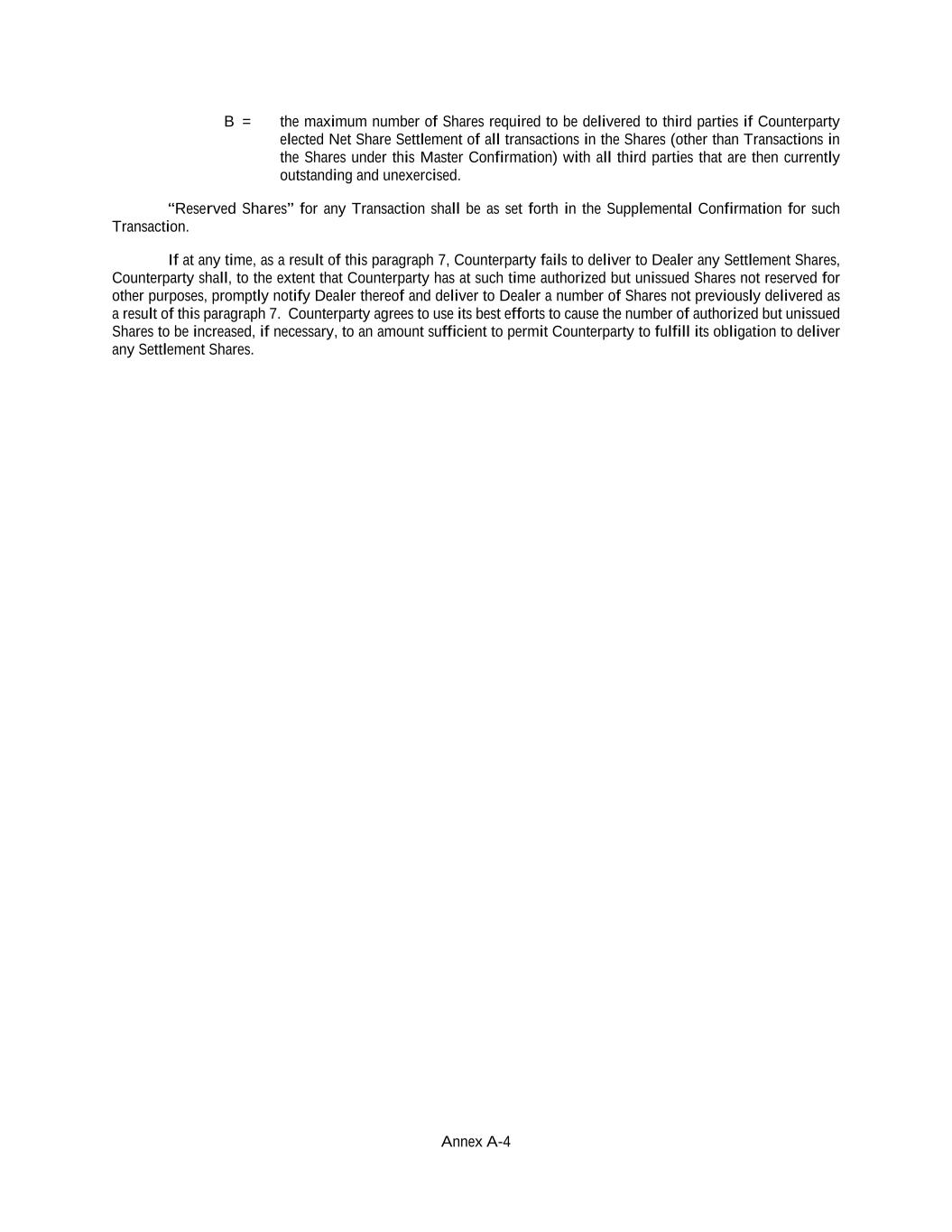 Annex A-4 B = the maximum number of Shares required to be delivered to third parties if Counterparty elected Net Share Settlement of all transactions in the Shares (other than Transactions in the Shares under this Master Confirmation) with all third parties that are then currently outstanding and unexercised. “Reserved Shares” for any Transaction shall be as set forth in the Supplemental Confirmation for such Transaction. If at any time, as a result of this paragraph 7, Counterparty fails to deliver to Dealer any Settlement Shares, Counterparty shall, to the extent that Counterparty has at such time authorized but unissued Shares not reserved for other purposes, promptly notify Dealer thereof and deliver to Dealer a number of Shares not previously delivered as a result of this paragraph 7. Counterparty agrees to use its best efforts to cause the number of authorized but unissued Shares to be increased, if necessary, to an amount sufficient to permit Counterparty to fulfill its obligation to deliver any Settlement Shares.