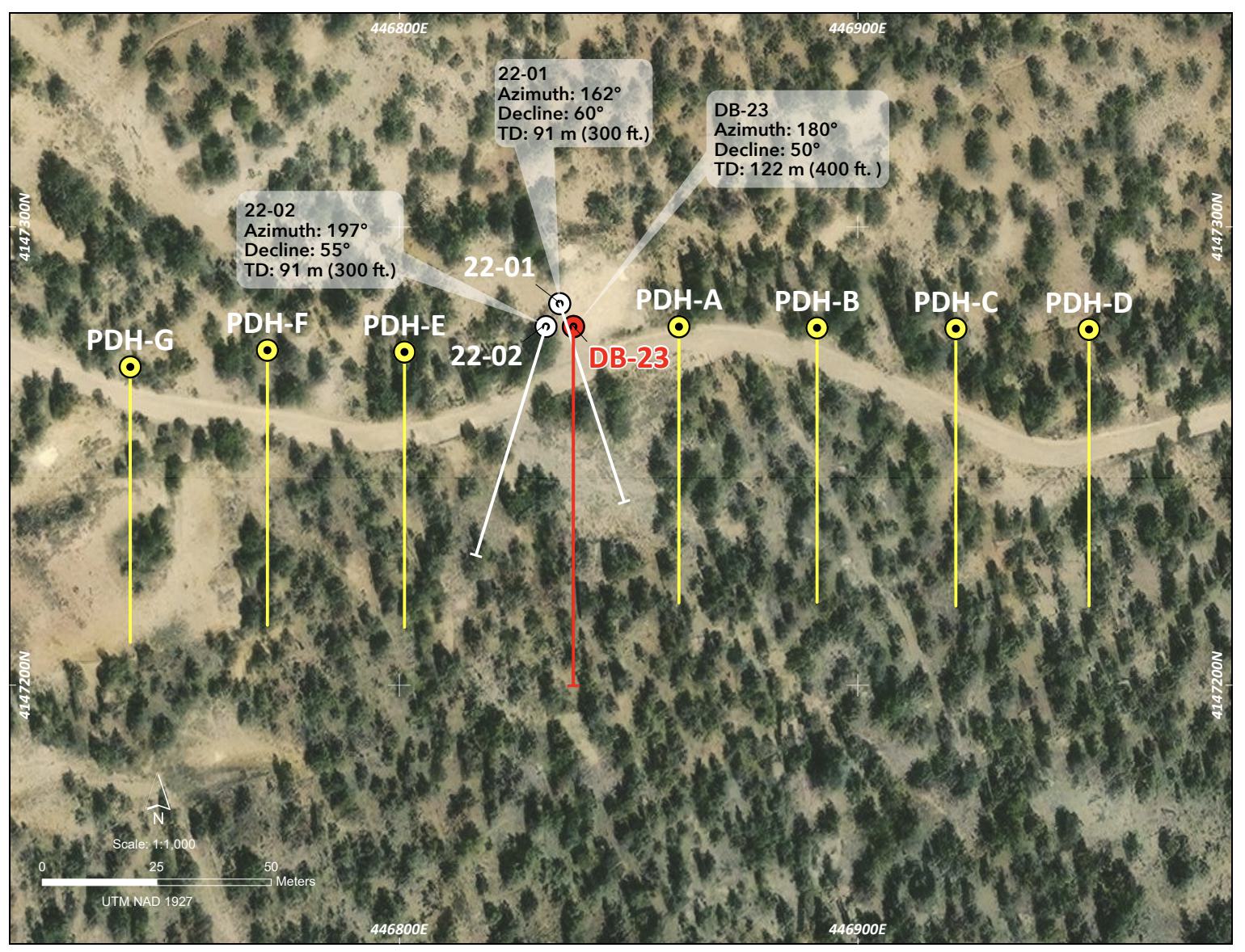 Figure 1. Map depicting discovery holes DB-23, 22-01 and 22-02 shown with proposed step-out Drill Hole locations.