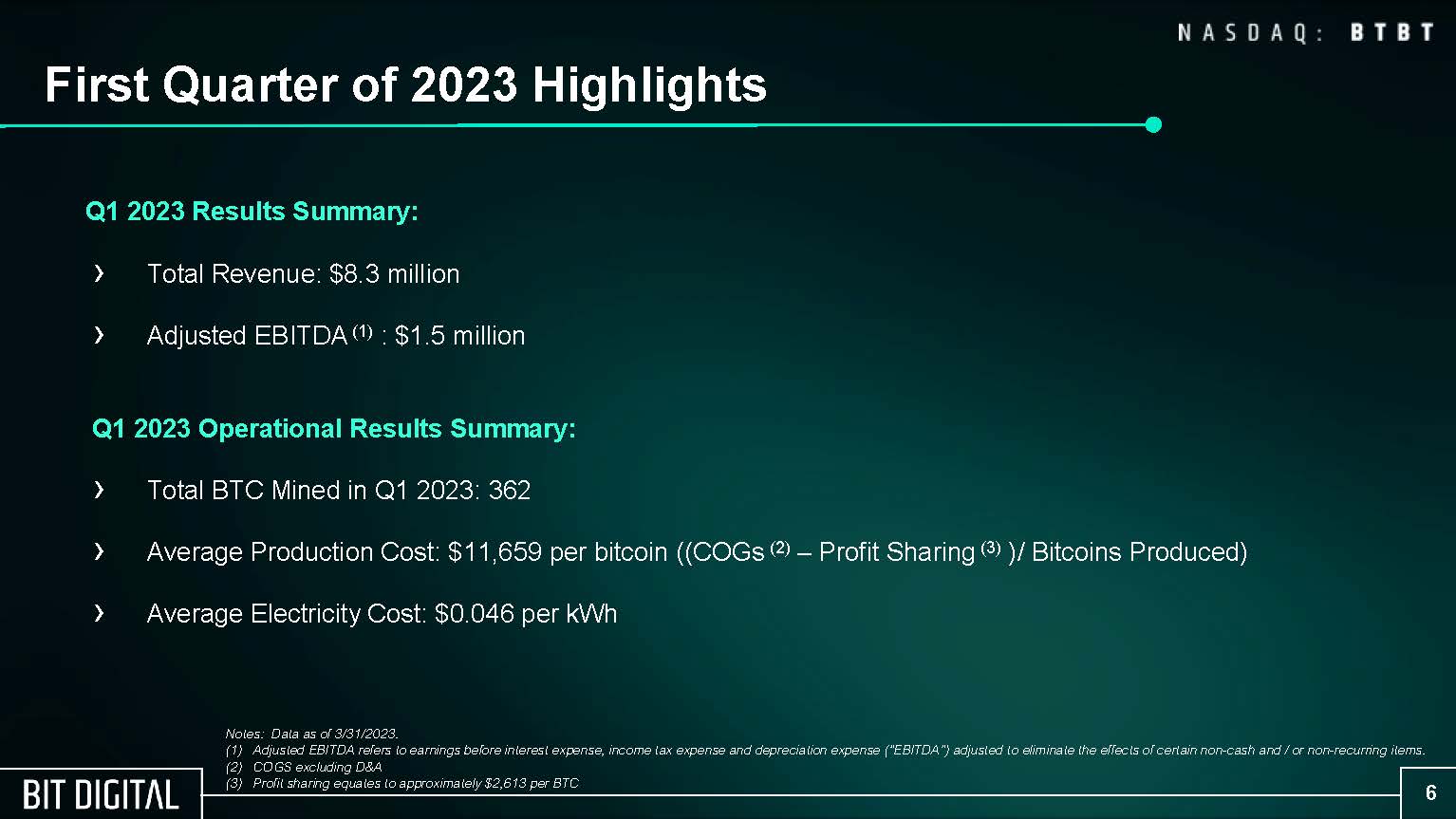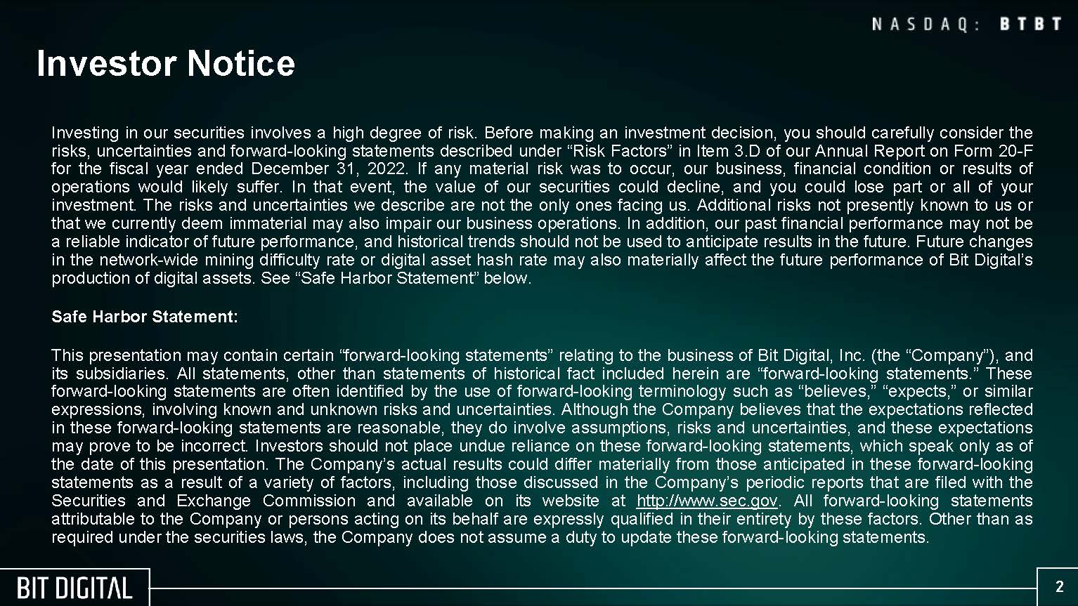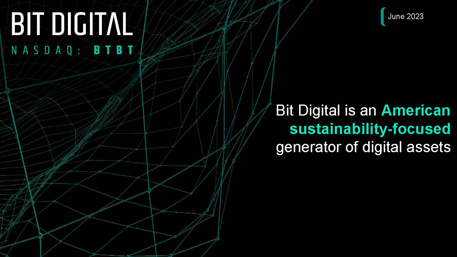 A copy of the Bit Digital, Inc. investor presentation dated June 2023, titled “Bit Digital is an American sustainability-focused generator of digital assets,” which is being shown on June 22, 2023 at the “Singular Research’s Summer Solstice June Investor Conference” in New York and is being furnished as Exhibit 99.1 with this Report on Form 6-K.
