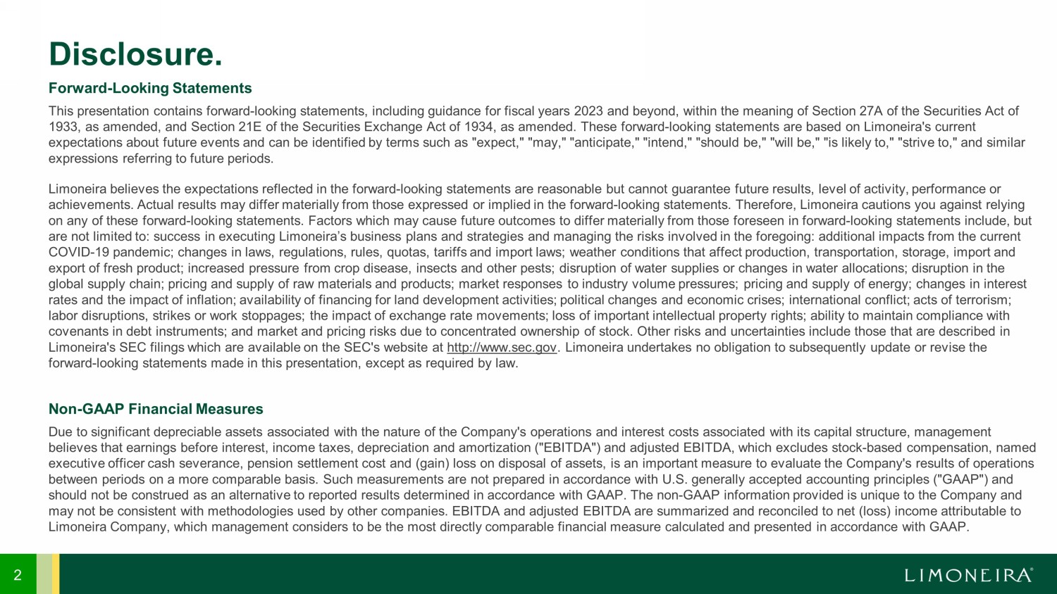 2 Disclosure. Forward - Looking Statements This presentation contains forward - looking statements, including guidance for fiscal years 2023 and beyond, within the meaning o f Section 27A of the Securities Act of 1933, as amended, and Section 21E of the Securities Exchange Act of 1934, as amended. These forward - looking statements are based on Limoneira's current expectations about future events and can be identified by terms such as "expect," "may," "anticipate," "intend," "should be," "w ill be," "is likely to," "strive to," and similar expressions referring to future periods. Limoneira believes the expectations reflected in the forward - looking statements are reasonable but cannot guarantee future resul ts, level of activity, performance or achievements. Actual results may differ materially from those expressed or implied in the forward - looking statements. Therefore, Limoneira cautions you against relying on any of these forward - looking statements. Factors which may cause future outcomes to differ materially from those foreseen in forward - looking statements include, but are not limited to: success in executing Limoneira’s business plans and strategies and managing the risks involved in the foregoing: additional impacts from the current COVID - 19 pandemic; changes in laws, regulations, rules, quotas, tariffs and import laws; weather conditions that affect producti on, transportation, storage, import and export of fresh product; increased pressure from crop disease, insects and other pests; disruption of water supplies or chang es in water allocations; disruption in the global supply chain; pricing and supply of raw materials and products; market responses to industry volume pressures; pricing an d supply of energy; changes in interest rates and the impact of inflation; availability of financing for land development activities; political changes and economic cri ses; international conflict; acts of terrorism; labor disruptions, strikes or work stoppages; the impact of exchange rate movements; loss of important intellectual property rig hts; ability to maintain compliance with covenants in debt instruments; and market and pricing risks due to concentrated ownership of stock. Other risks and uncertain tie s include those that are described in Limoneira's SEC filings which are available on the SEC's website at http://www.sec.gov . Limoneira undertakes no obligation to subsequently update or revise the forward - looking statements made in this presentation, except as required by law. Non - GAAP Financial Measures Due to significant depreciable assets associated with the nature of the Company's operations and interest costs associated wi th its capital structure, management believes that earnings before interest, income taxes, depreciation and amortization ("EBITDA") and adjusted EBITDA, which exc lud es stock - based compensation, named executive officer cash severance, pension settlement cost and (gain) loss on disposal of assets, is an important measure to e val uate the Company's results of operations between periods on a more comparable basis. Such measurements are not prepared in accordance with U.S. generally accepted acc oun ting principles ("GAAP") and should not be construed as an alternative to reported results determined in accordance with GAAP. The non - GAAP information provi ded is unique to the Company and may not be consistent with methodologies used by other companies. EBITDA and adjusted EBITDA are summarized and reconciled to ne t (loss) income attributable to Limoneira Company, which management considers to be the most directly comparable financial measure calculated and presented i n a ccordance with GAAP.