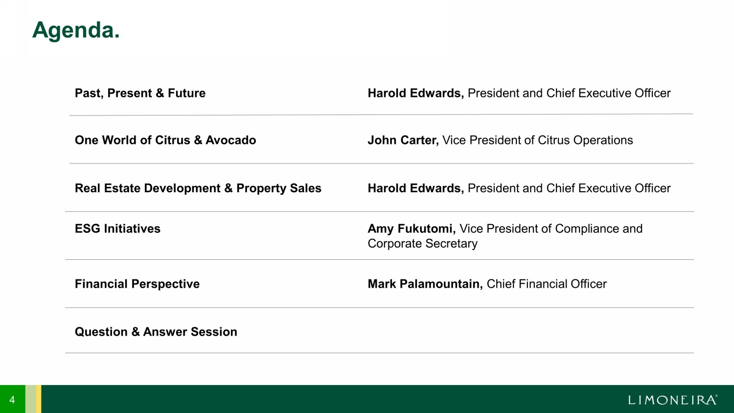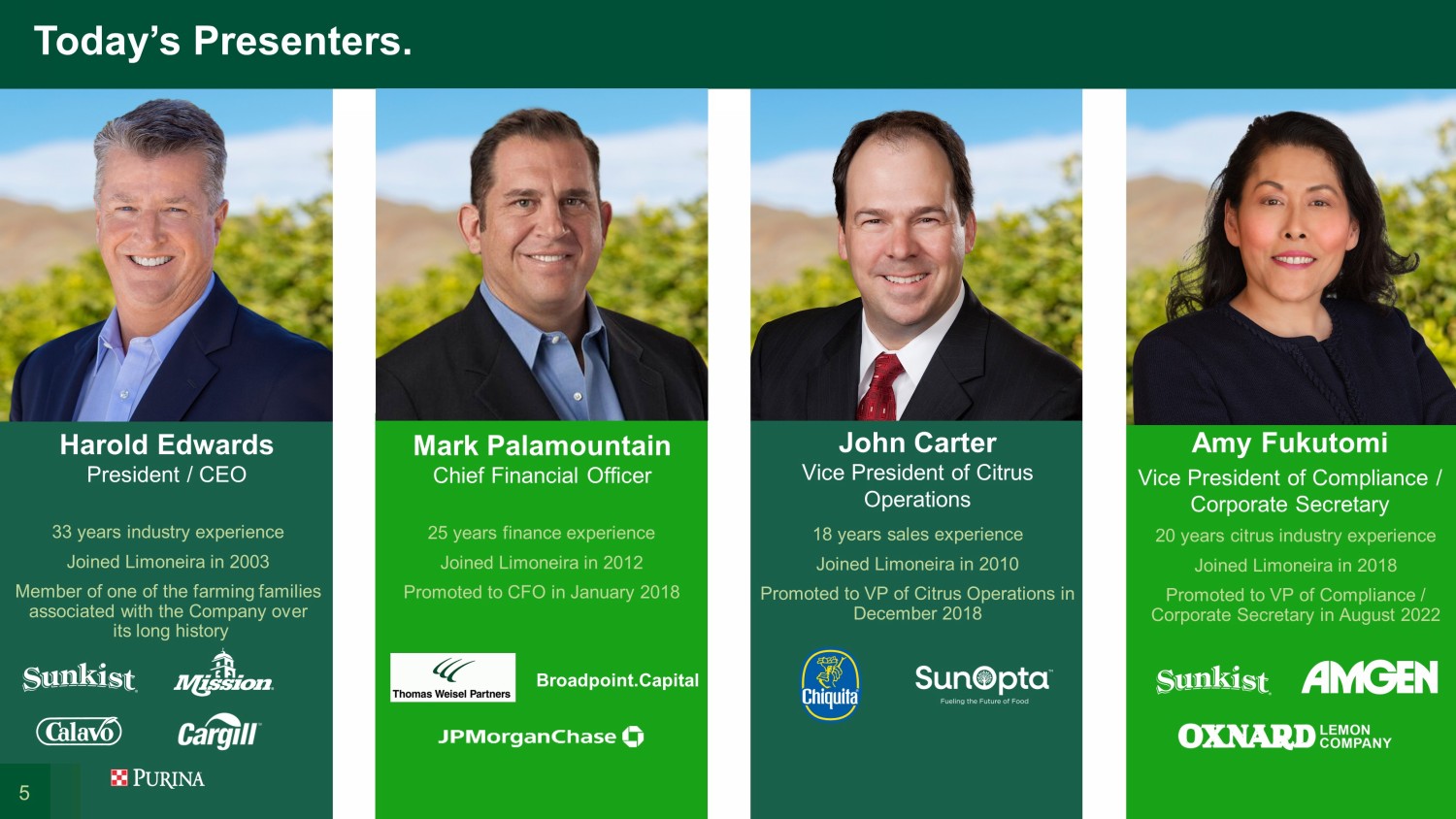Financial Perspective Mark Palamountain, Chief Financial Officer 4 Agenda. ESG Initiatives Amy Fukutomi, Vice President of Compliance and Corporate Secretary Past, Present & Future Harold Edwards, President and Chief Executive Officer Question & Answer Session Real Estate Development & Property Sales Harold Edwards, President and Chief Executive Officer One World of Citrus & Avocado John Carter, Vice President of Citrus Operations