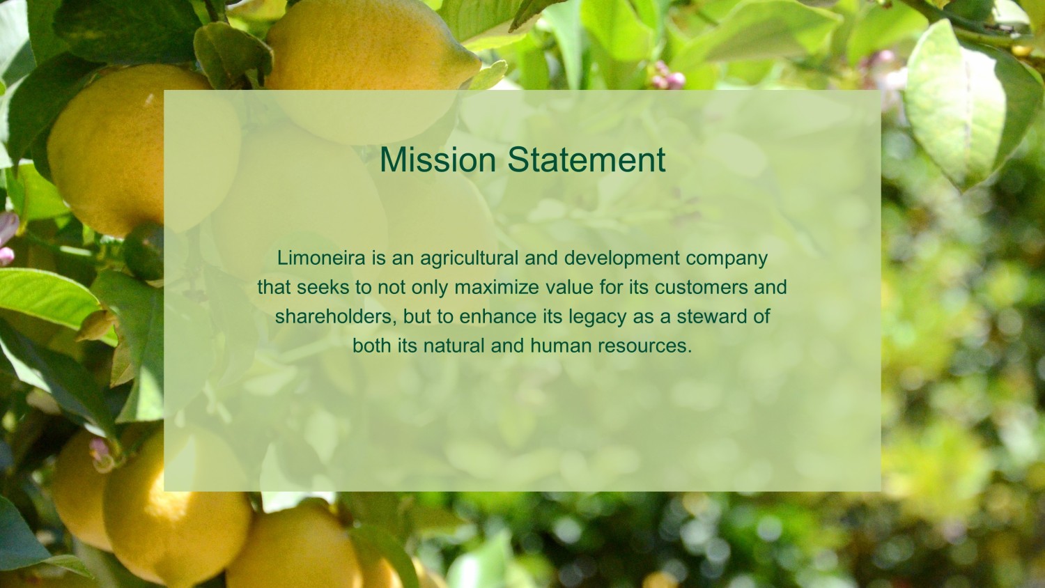 Mission Statement Limoneira is an agricultural and development company that seeks to not only maximize value for its customers and shareholders, but to enhance its legacy as a steward of both its natural and human resources.
