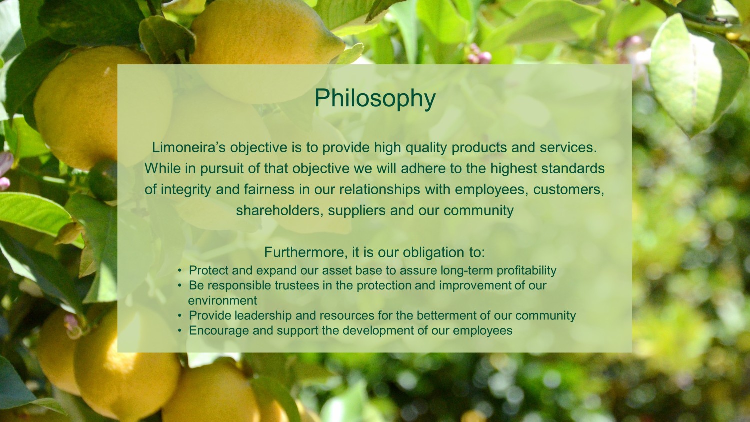 Philosophy Limoneira’s objective is to provide high quality products and services. While in pursuit of that objective we will adhere to the highest standards of integrity and fairness in our relationships with employees, customers, shareholders, suppliers and our community Furthermore, it is our obligation to: • Protect and expand our asset base to assure long - term profitability • Be responsible trustees in the protection and improvement of our environment • Provide leadership and resources for the betterment of our community • Encourage and support the development of our employees