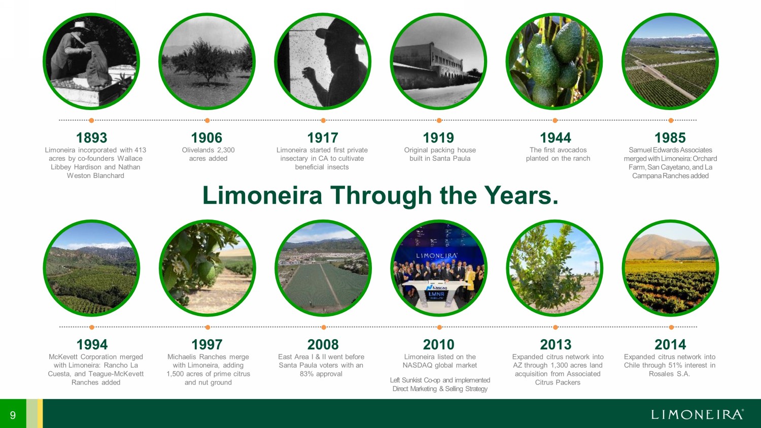 Limoneira incorporated with 413 acres by co - founders Wallace Libbey Hardison and Nathan Weston Blanchard 1893 Olivelands 2,300 acres added 1906 Limoneira started first private insectary in CA to cultivate beneficial insects 1917 Original packing house built in Santa Paula 1919 The first avocados planted on the ranch 1944 Samuel Edwards Associates merged with Limoneira: Orchard Farm, San Cayetano, and La Campana Ranches added 1985 McKevett Corporation merged with Limoneira : Rancho La Cuesta, and Teague - McKevett Ranches added 1994 Michaelis Ranches merge with Limoneira , adding 1,500 acres of prime citrus and nut ground 1997 East Area I & II went before Santa Paula voters with an 83% approval 2008 Limoneira listed on the NASDAQ global market Left Sunkist Co - op and implemented Direct Marketing & Selling Strategy 2010 Expanded citrus network into AZ through 1,300 acres land acquisition from Associated Citrus Packers 2013 Expanded citrus network into Chile through 51% interest in Rosales S.A. 2014 Limoneira Through the Years. 9