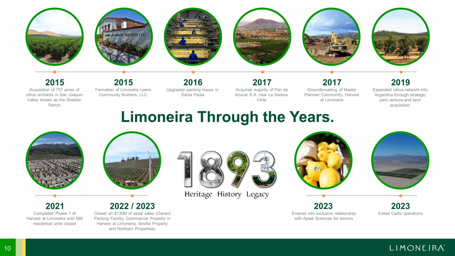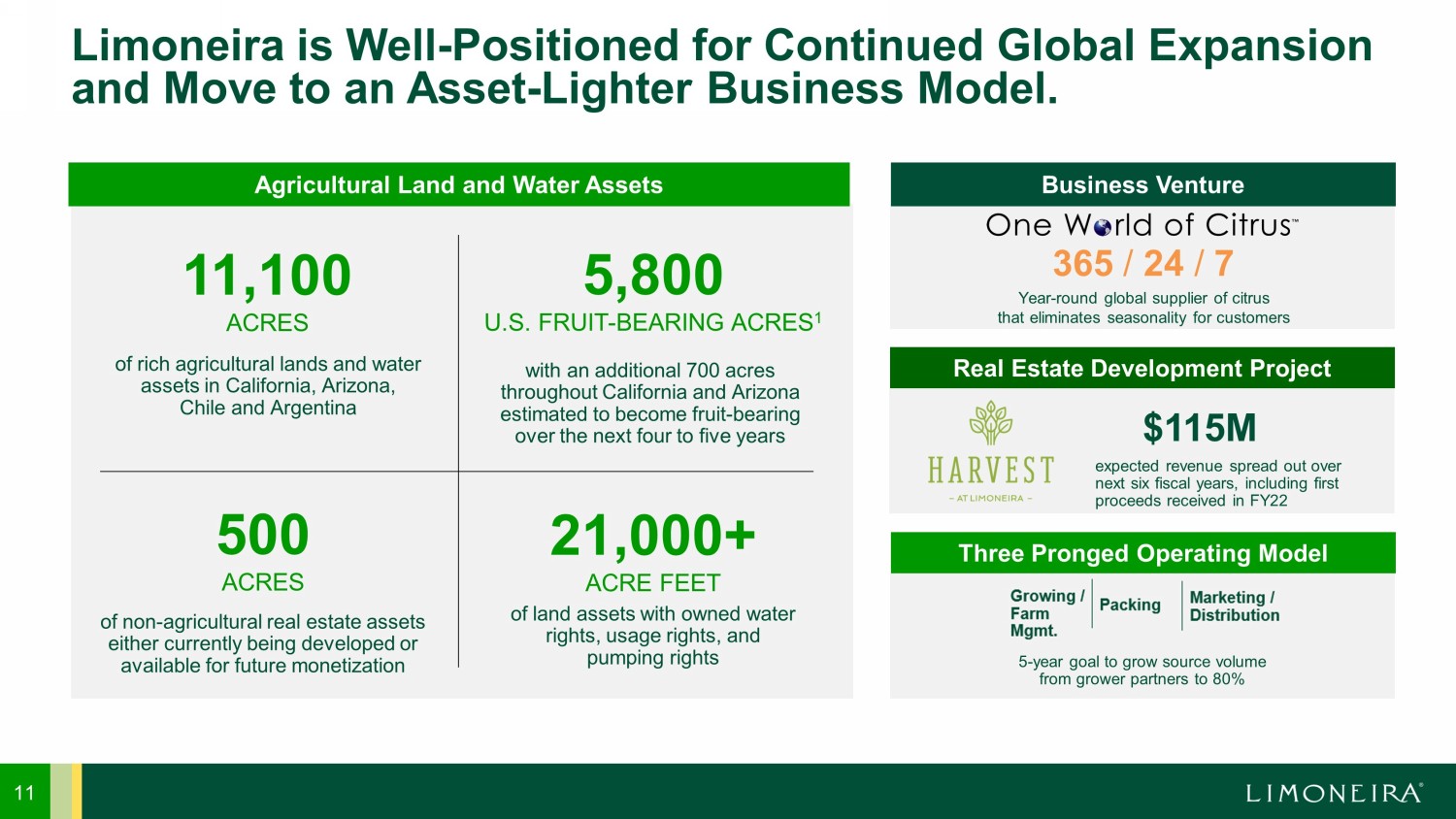 Acquisition of 757 acres of citrus orchards in San Joaquin Valley known as the Sheldon Ranch 2015 Formation of Limoneira Lewis Community Builders, LLC 2015 Upgraded packing house in Santa Paula 2016 Acquired majority of Pan de Azucar S.A. near La Serena, Chile 2017 Groundbreaking of Master Planned Community, Harvest at Limoneira 2017 Expanded citrus network into Argentina through strategic joint venture and land acquisition 2019 Completed Phase 1 of Harvest at Limoneira with 586 residential units closed 2021 Closed on $130M of asset sales (Oxnard Packing Facility, Commercial Property in Harvest at Limoneira, Sevilla Property and Northern Properties) 2022 / 2023 Entered into exclusive relationship with Apeel Sciences for lemons 2023 Exited Cadiz operations 2023 Limoneira Through the Years. 10
