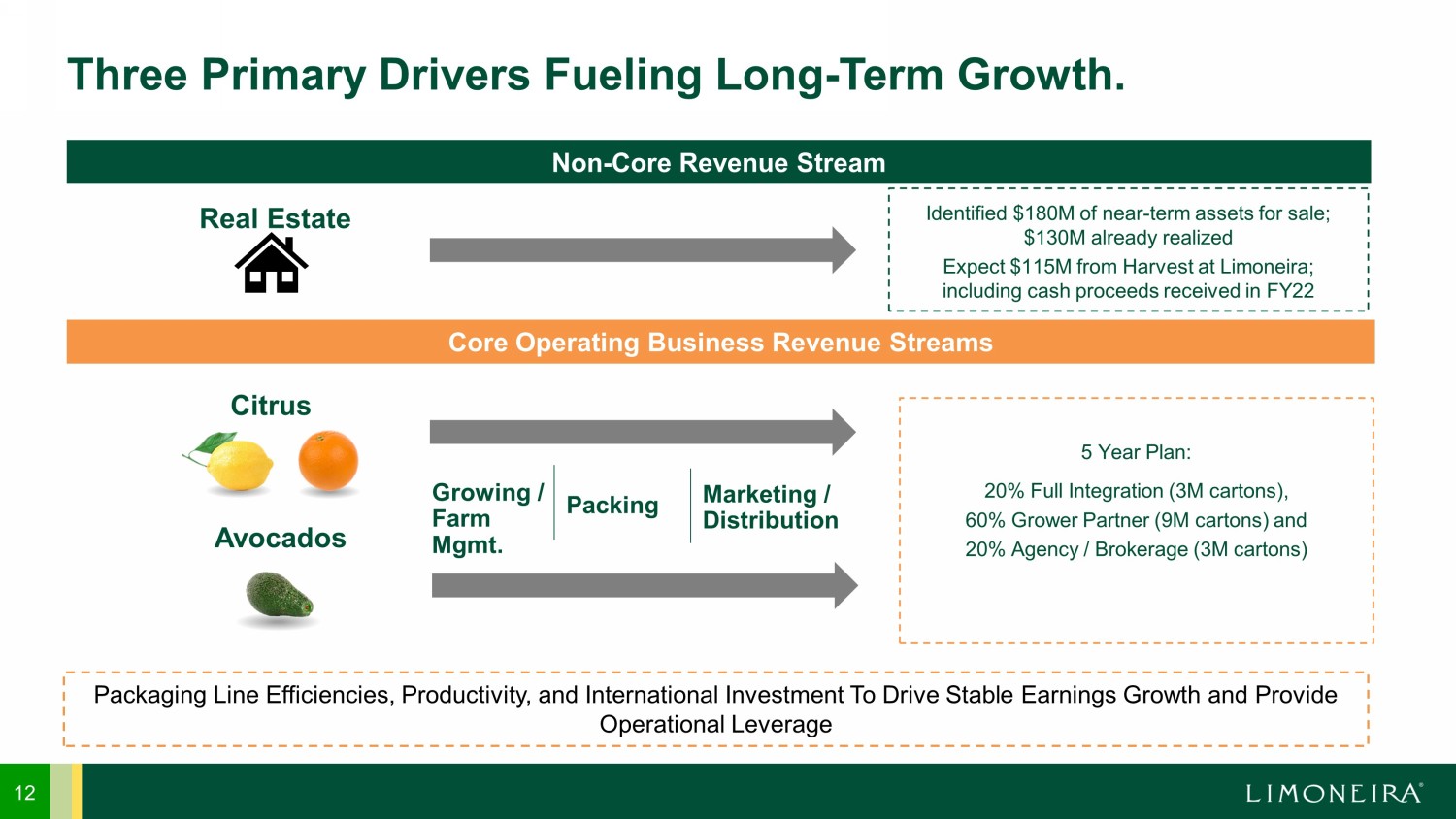 5,800 U.S. FRUIT - BEARING ACRES 1 11 Limoneira is Well - Positioned for Continued Global Expansion and Move to an Asset - Lighter Business Model. Year - round global supplier of citrus that eliminates seasonality for customers Real Estate Development Project expected revenue spread out over next six fiscal years, including first proceeds received in FY22 $115M Business Venture 365 / 24 / 7 Agricultural Land and Water Assets of non - agricultural real estate assets either currently being developed or available for future monetization 500 ACRES of land assets with owned water rights, usage rights, and pumping rights 21,000+ ACRE FEET of rich agricultural lands and water assets in California, Arizona, Chile and Argentina 11,100 ACRES with an additional 700 acres throughout California and Arizona estimated to become fruit - bearing over the next four to five years Three Pronged Operating Model 5 - year goal to grow source volume from grower partners to 80%