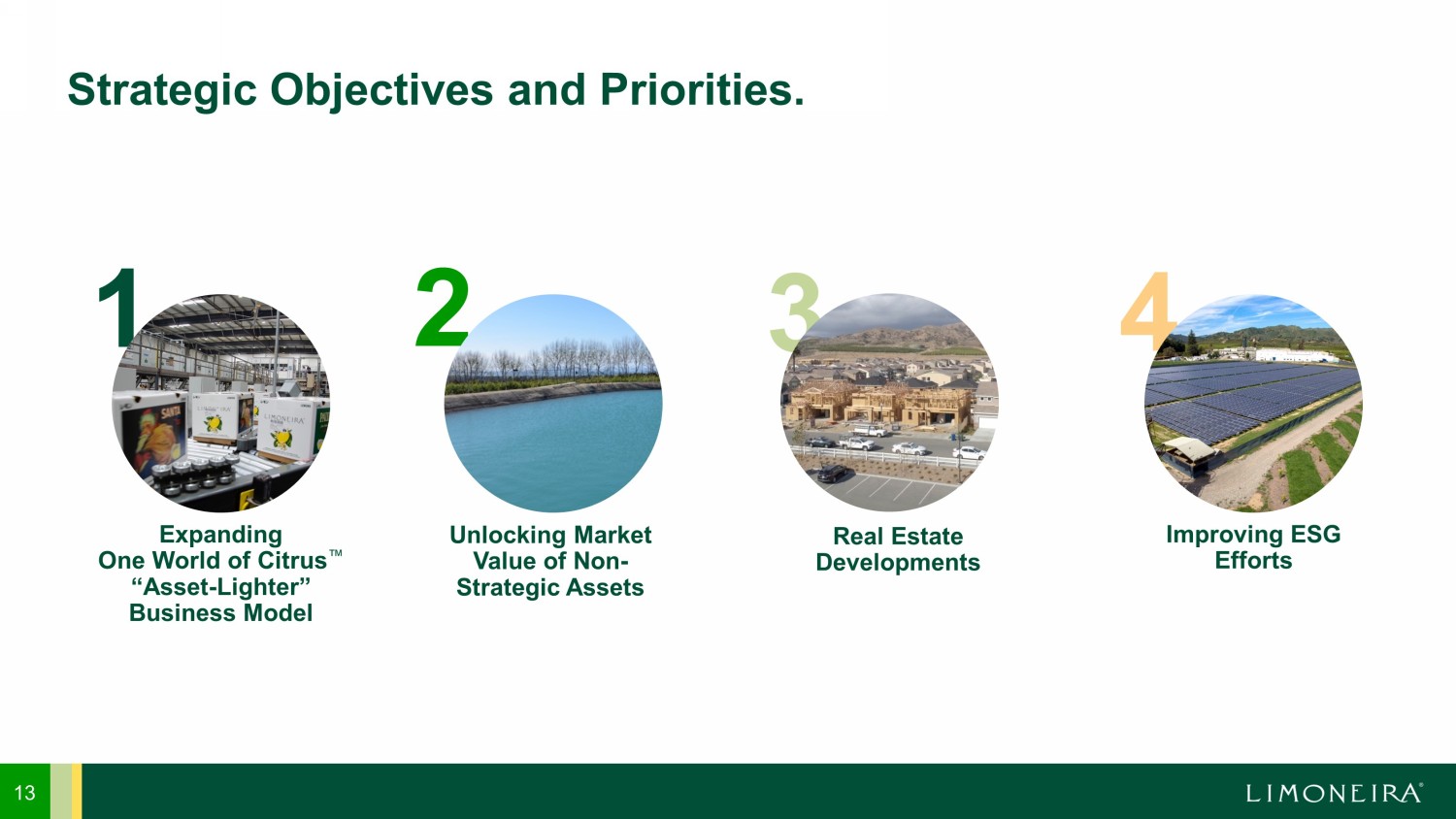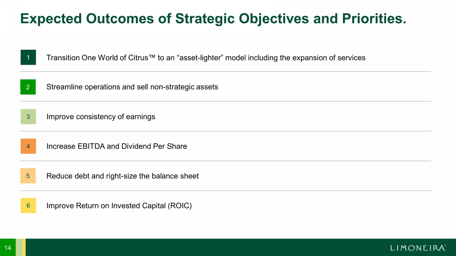 2 3 4 1 13 Strategic Objectives and Priorities. Expanding One World of Citrus “Asset - Lighter” Business Model Improving ESG Efforts Unlocking Market Value of Non - Strategic Assets Real Estate Developments