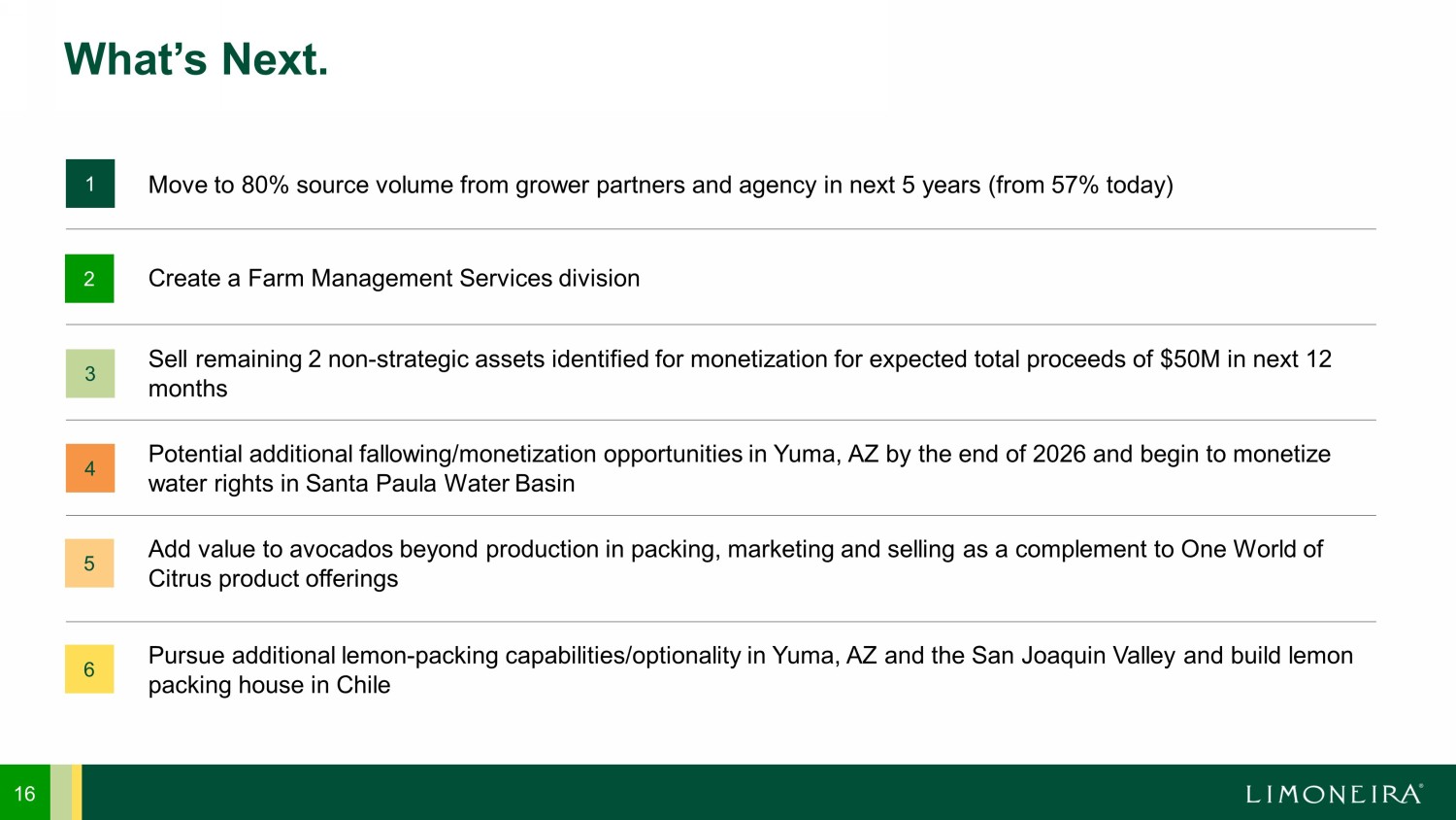 Pivoted in San Joaquin Valley to farming services provider, packer, marketer and seller 15 Progress to Date. Established a new 3 - year fallowing program in Yuma, AZ that will drive ~$1.3M of additional revenue from not farming ~600 of total 1,300 acres Developed a grower services team that recruited ~1M additional cartons of fresh lemons from new grower partners Sold 4 out of the 6 non - strategic assets identified for monetization for a total of $130M in proceeds, $50M remaining x x x x Entered into exclusive relationship with Apeel Sciences x x Eliminated unprofitable operations in Cadiz x Terminated long - term retirement plan for annual savings of $1M x Reduced net debt position to $31.5M