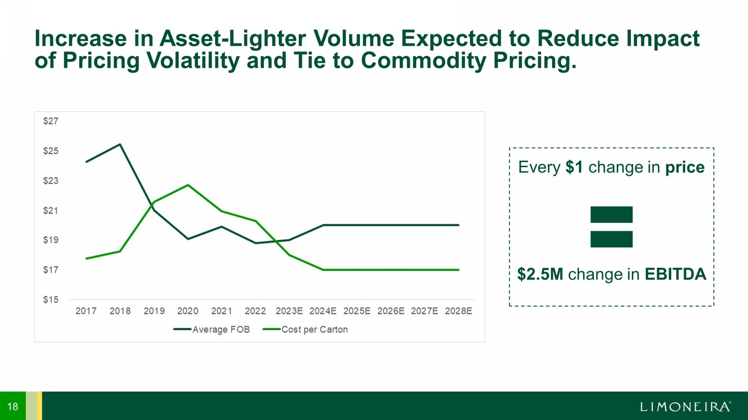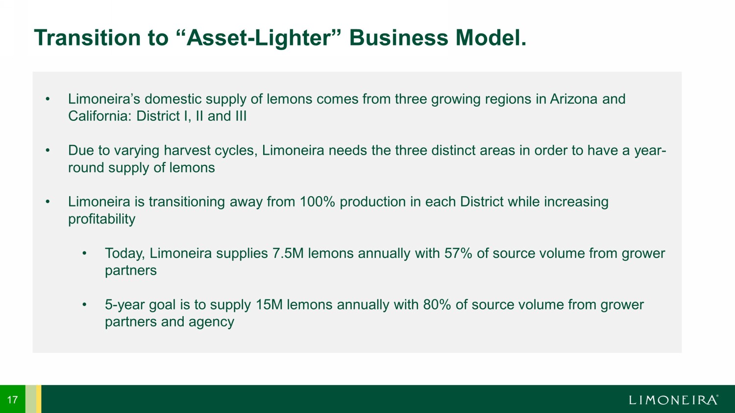 17 Transition to “Asset - Lighter” Business Model. • Limoneira’s domestic supply of lemons comes from three growing regions in Arizona and California: District I, II and III • Due to varying harvest cycles, Limoneira needs the three distinct areas in order to have a year - round supply of lemons • Limoneira is transitioning away from 100% production in each District while increasing profitability • Today, Limoneira supplies 7.5M lemons annually with 57% of source volume from grower partners • 5 - year goal is to supply 15M lemons annually with 80% of source volume from grower partners and agency
