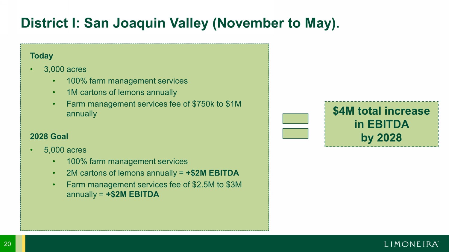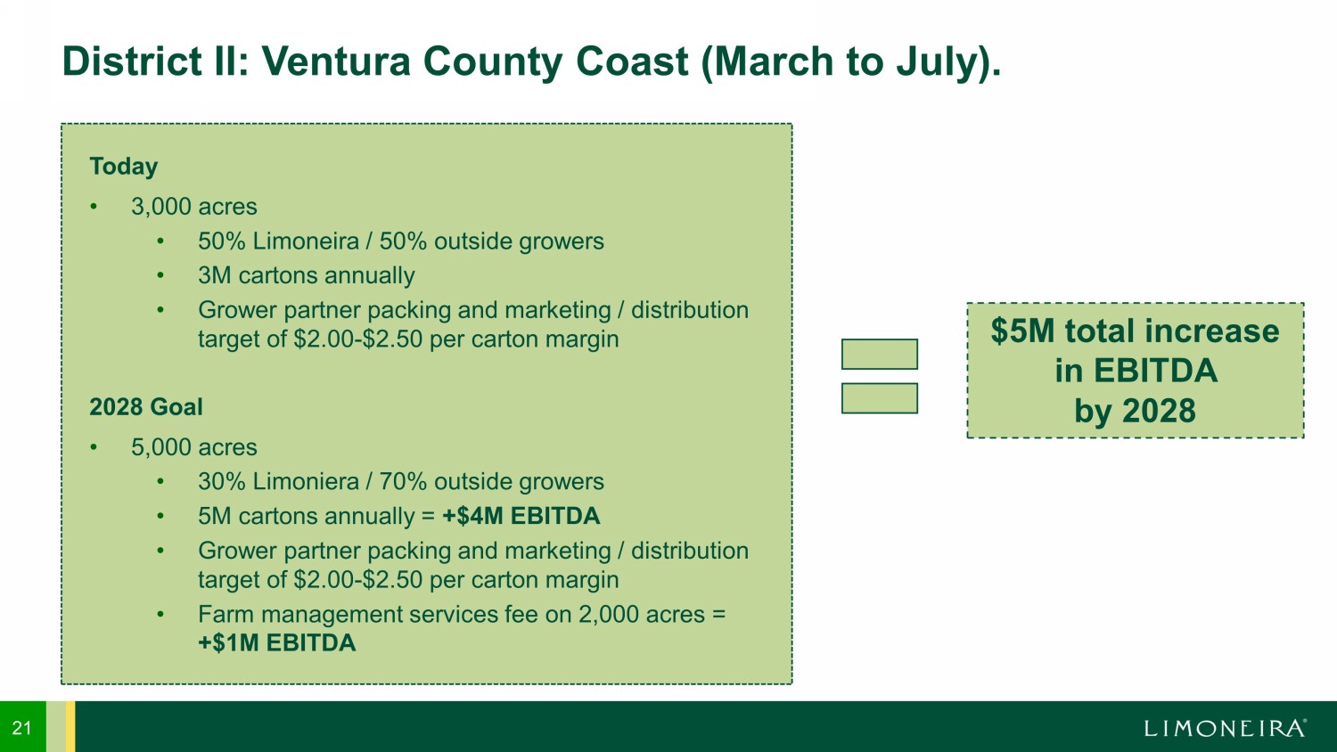 20 District I: San Joaquin Valley (November to May). Today • 3,000 acres • 100% farm management services • 1M cartons of lemons annually • Farm management services fee of $750k to $1M annually 2028 Goal • 5,000 acres • 100% farm management services • 2M cartons of lemons annually = +$2M EBITDA • Farm management services fee of $2.5M to $3M annually = +$2M EBITDA $4M total increase in EBITDA by 2028