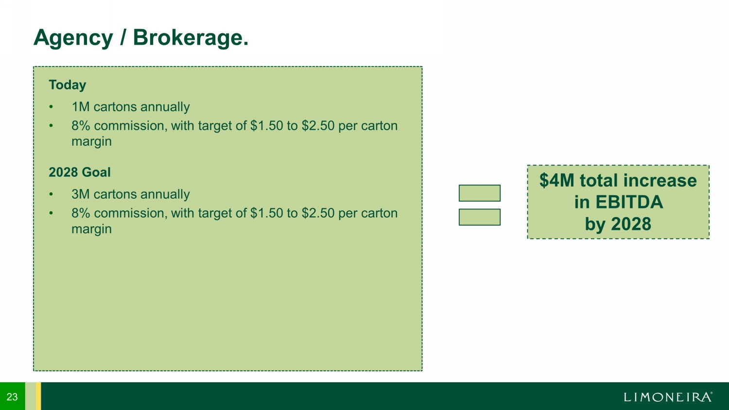 23 Agency / Brokerage. Today • 1M cartons annually • 8% commission, with target of $1.50 to $2.50 per carton margin 2028 Goal • 3M cartons annually • 8% commission, with target of $1.50 to $2.50 per carton margin $4M total increase in EBITDA by 2028