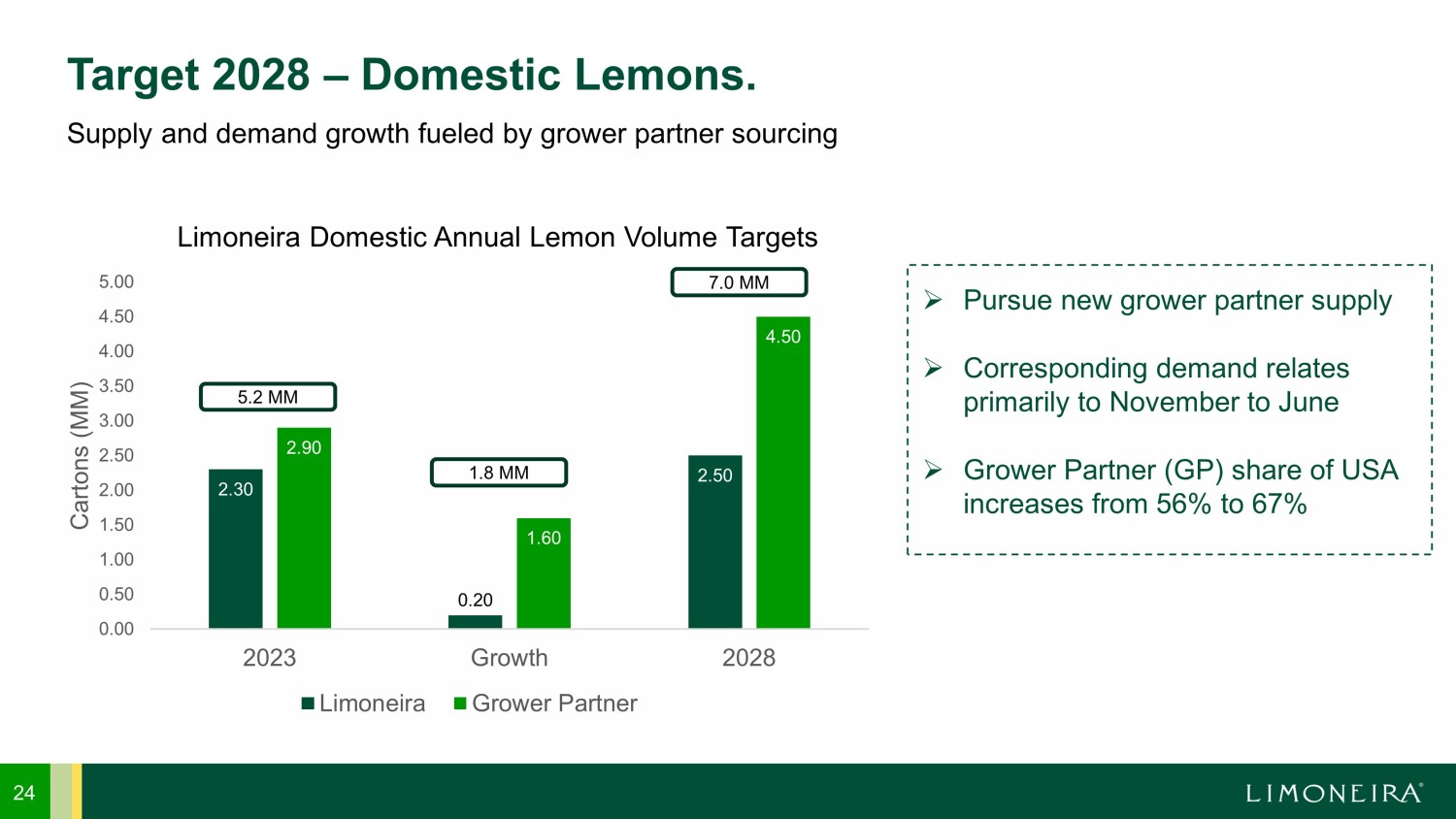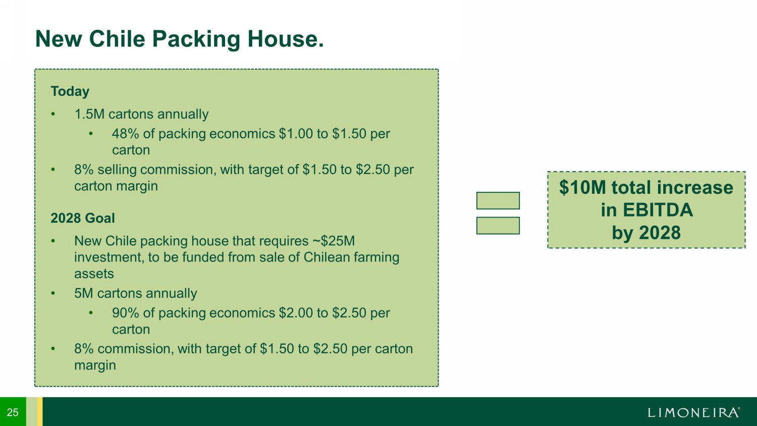 Supply and demand growth fueled by grower partner sourcing 24 Target 2028 – Domestic Lemons. 2.30 0.20 2.50 2.90 1.60 4.50 0.00 0.50 1.00 1.50 2.00 2.50 3.00 3.50 4.00 4.50 5.00 2023 Growth 2028 Cartons (MM) Limoneira Domestic Annual Lemon Volume Targets Limoneira Grower Partner 5.2 MM 1.8 MM 7.0 MM » Pursue new grower partner supply » Corresponding demand relates primarily to November to June » Grower Partner (GP) share of USA increases from 56% to 67%