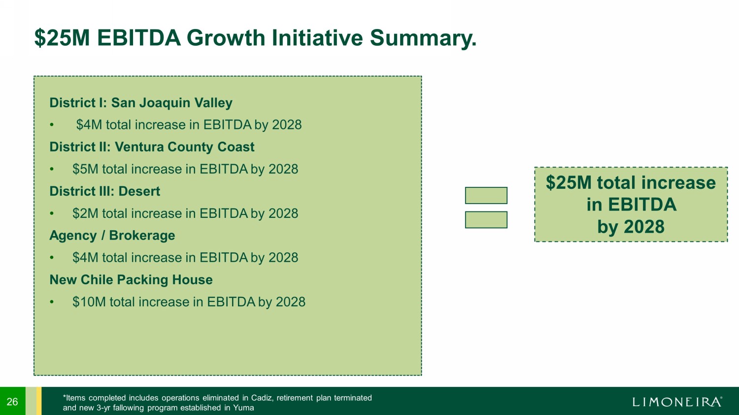 25 New Chile Packing House. Today • 1.5M cartons annually • 48% of packing economics $1.00 to $1.50 per carton • 8% selling commission, with target of $1.50 to $2.50 per carton margin 2028 Goal • New Chile packing house that requires ~$25M investment, to be funded from sale of Chilean farming assets • 5M cartons annually • 90% of packing economics $2.00 to $2.50 per carton • 8% commission, with target of $1.50 to $2.50 per carton margin $10M total increase in EBITDA by 2028