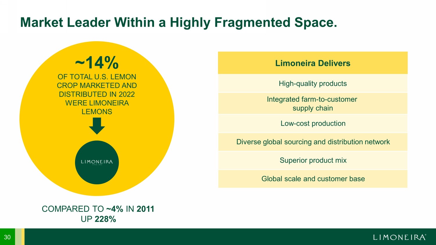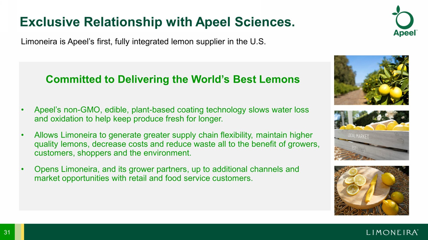 High - quality products Integrated farm - to - customer supply chain Low - cost production Diverse global sourcing and distribution network Superior product mix Global scale and customer base 30 Market Leader Within a Highly Fragmented Space. Limoneira Delivers COMPARED TO ~4% IN 2011 UP 228% ~14% OF TOTAL U.S. LEMON CROP MARKETED AND DISTRIBUTED IN 2022 WERE LIMONEIRA LEMONS