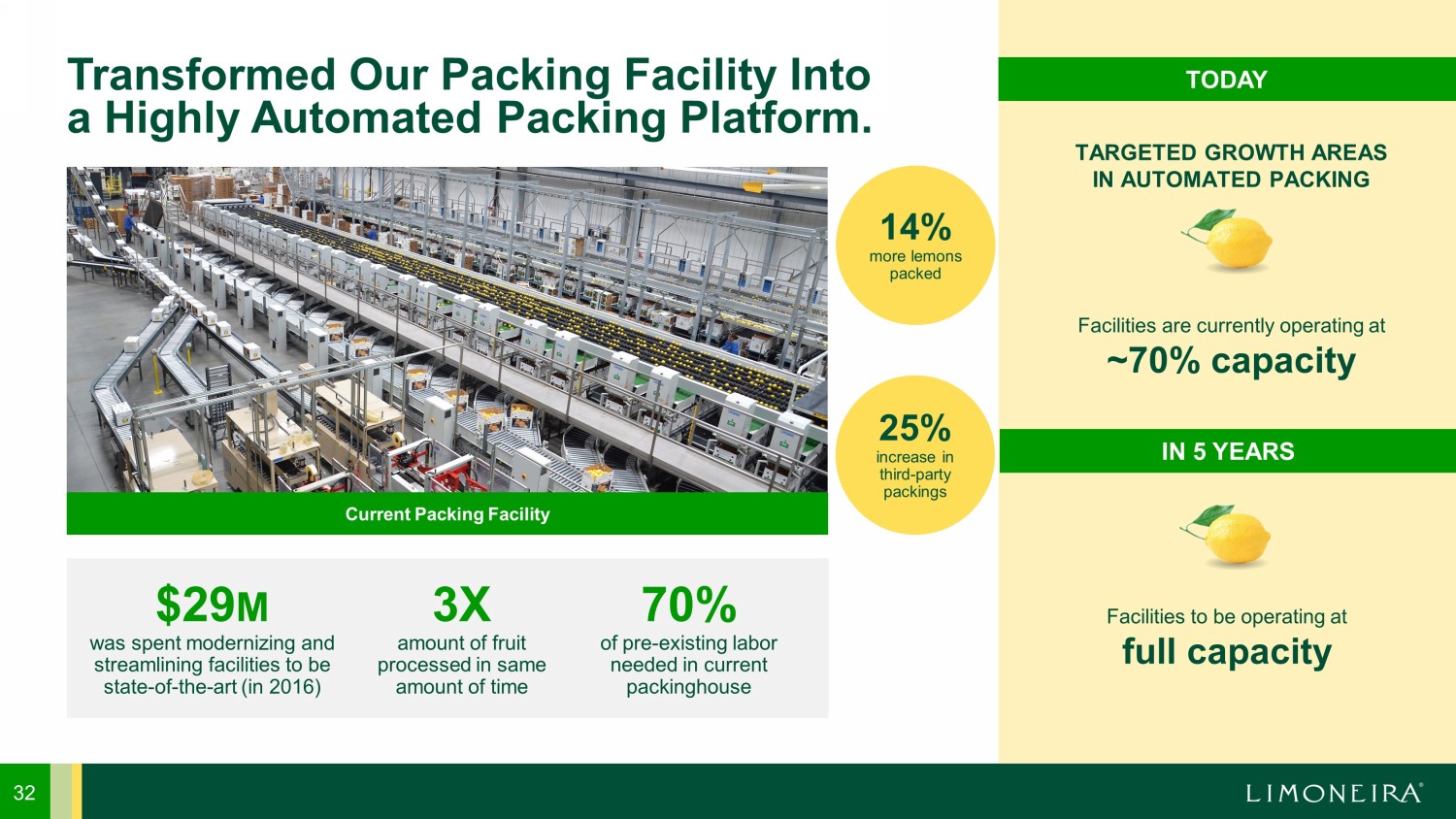 32 Transformed Our Packing Facility Into a Highly Automated Packing Platform. Current Packing Facility $29 M was spent modernizing and streamlining facilities to be state - of - the - art (in 2016) 14% more lemons packed 25% increase in third - party packings Facilities are currently operating at ~70% capacity TARGETED GROWTH AREAS IN AUTOMATED PACKING 3X amount of fruit processed in same amount of time 70% of pre - existing labor needed in current packinghouse TODAY IN 5 YEARS Facilities to be operating at full capacity