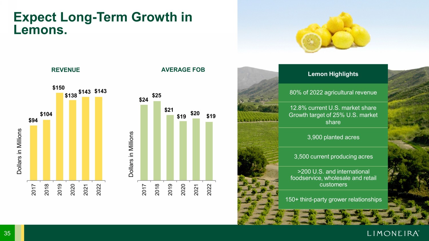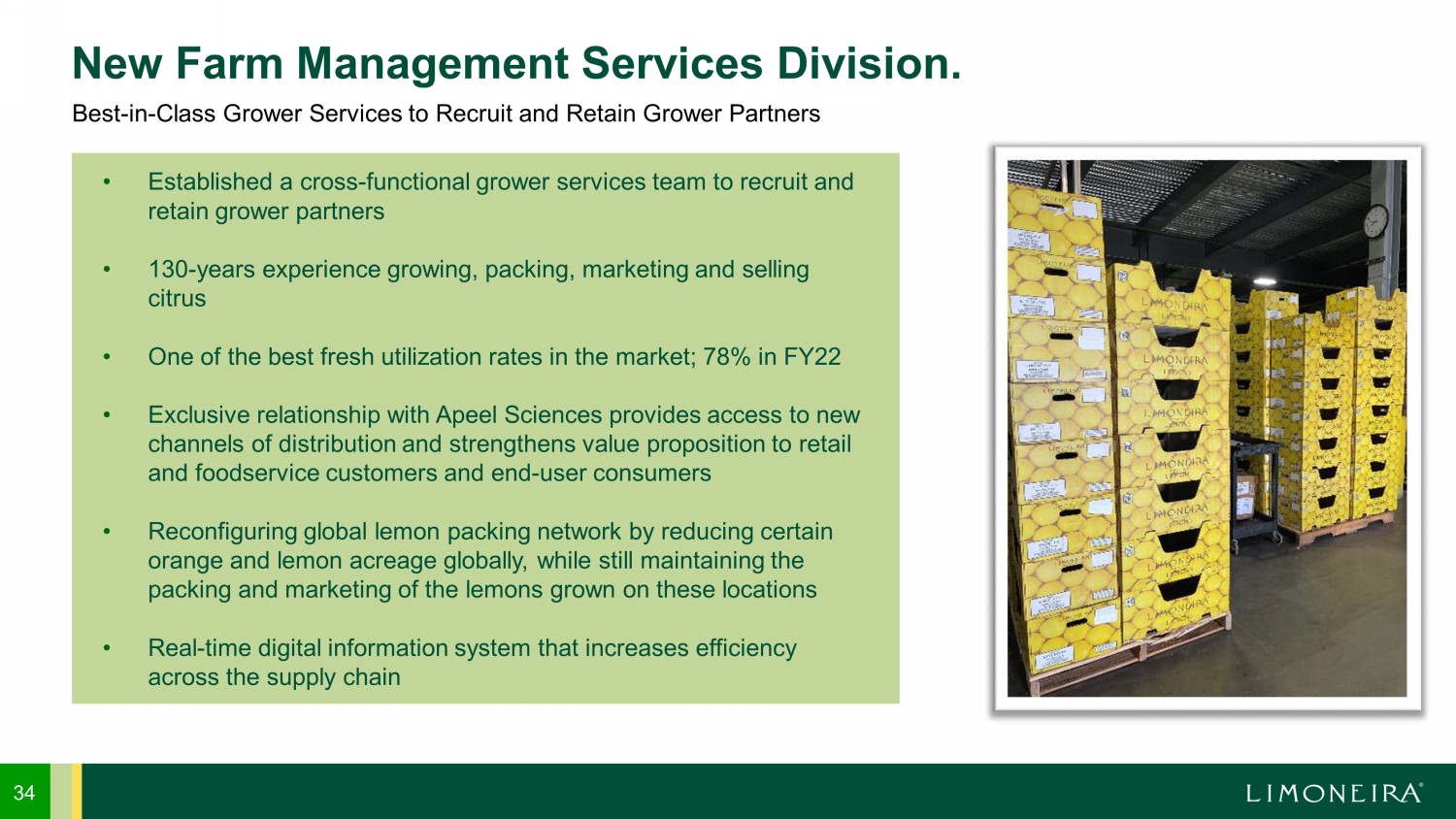 34 New Farm Management Services Division. • Established a cross - functional grower services team to recruit and retain grower partners • 130 - years experience growing, packing, marketing and selling citrus • One of the best fresh utilization rates in the market; 78% in FY22 • Exclusive relationship with Apeel Sciences provides access to new channels of distribution and strengthens value proposition to retail and foodservice customers and end - user consumers • Reconfiguring global lemon packing network by reducing certain orange and lemon acreage globally, while still maintaining the packing and marketing of the lemons grown on these locations • Real - time digital information system that increases efficiency across the supply chain Best - in - Class Grower Services to Recruit and Retain Grower Partners