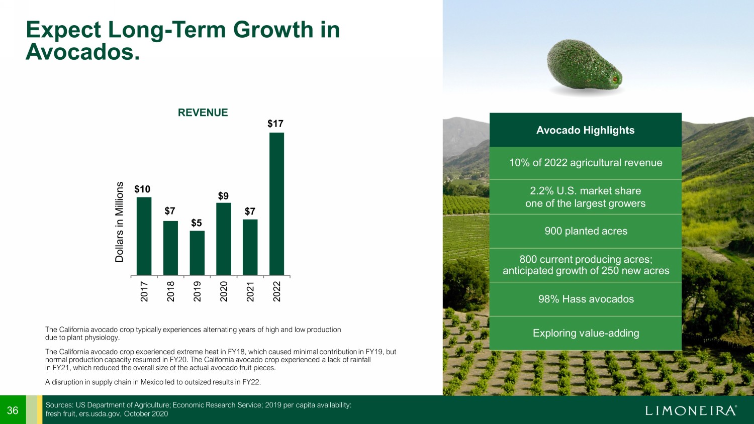 $94 $104 $150 $138 $143 $143 2017 2018 2019 2020 2021 2022 $24 $25 $21 $19 $20 $19 2017 2018 2019 2020 2021 2022 35 REVENUE Dollars in Millions 80% of 2022 agricultural revenue 12.8% current U.S. market share Growth target of 25% U.S. market share 3,900 planted acres 3,500 current producing acres >200 U.S. and international foodservice, wholesale and retail customers 150+ third - party grower relationships Lemon Highlights Expect Long - Term Growth in Lemons. AVERAGE FOB Dollars in Millions