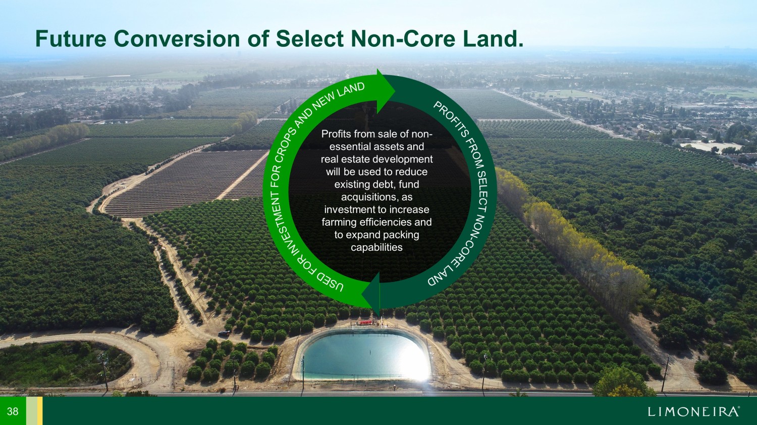 Profits from sale of non - essential assets and real estate development will be used to reduce existing debt, fund acquisitions, as investment to increase farming efficiencies and to expand packing capabilities 38 Future Conversion of Select Non - Core Land.