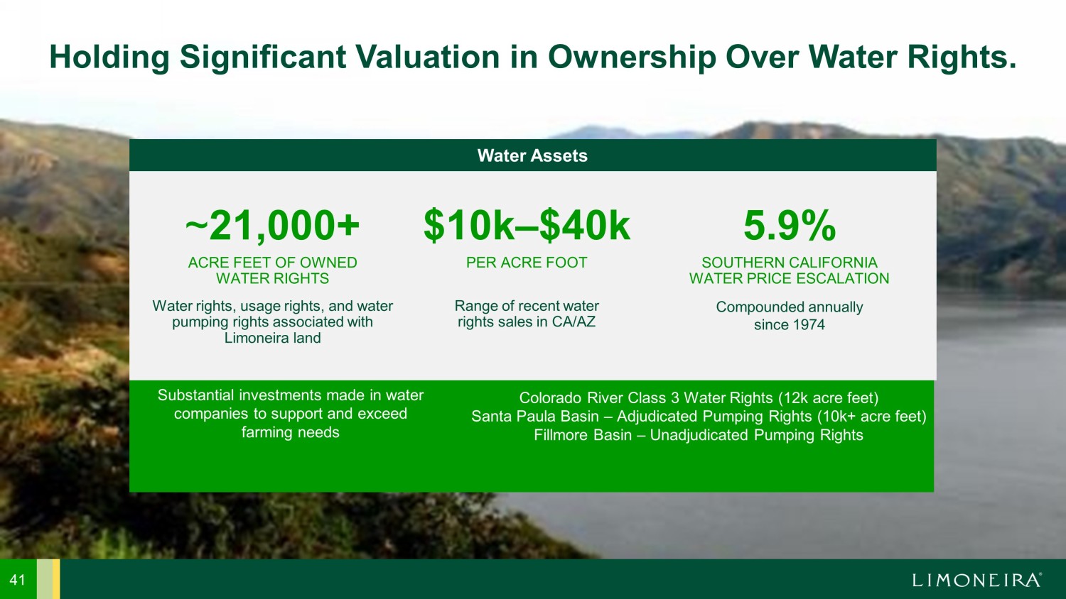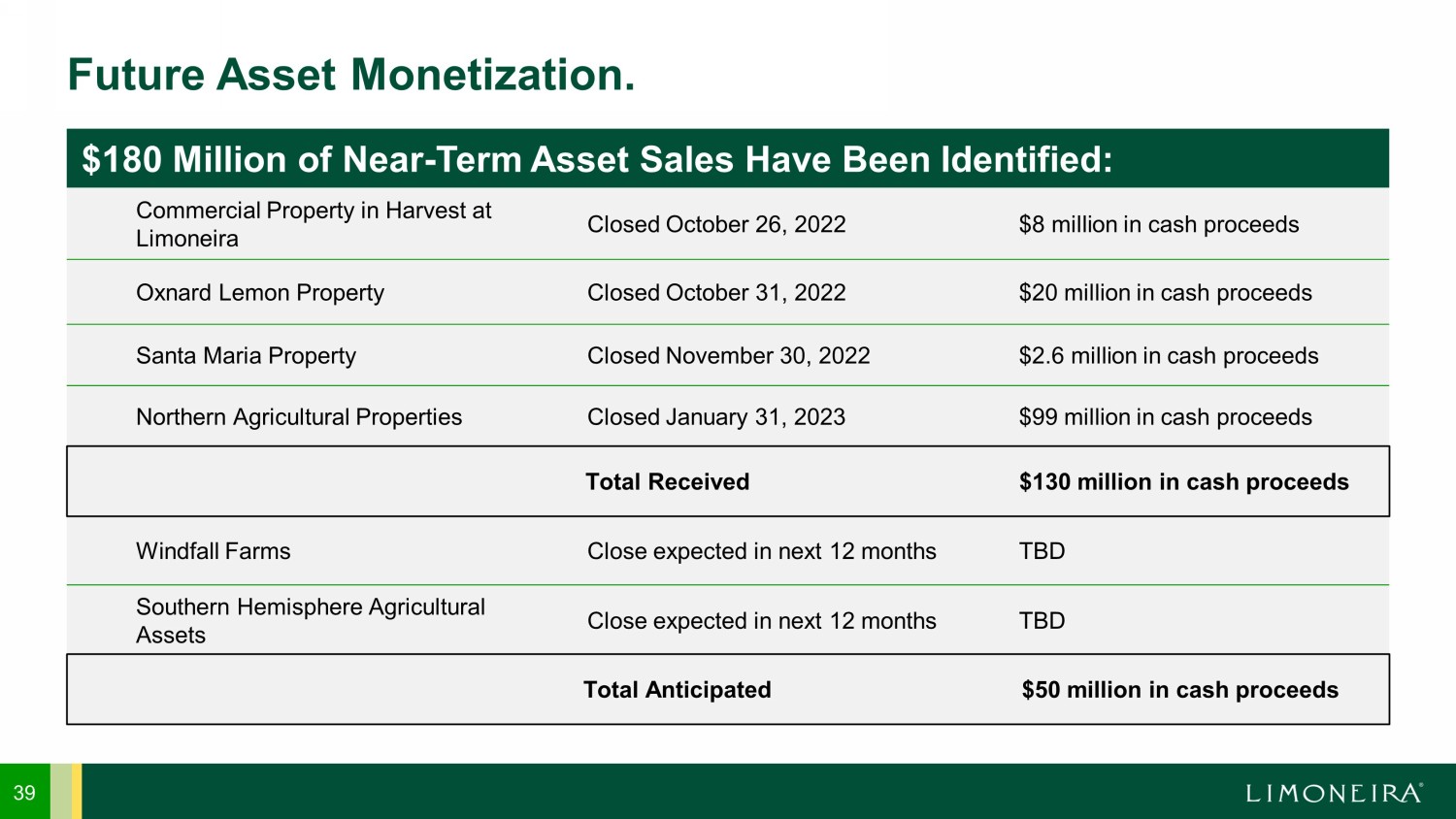 39 Future Asset Monetization. $180 Million of Near - Term Asset Sales Have Been Identified: Commercial Property in Harvest at Limoneira Closed October 26, 2022 $8 million in cash proceeds Oxnard Lemon Property Closed October 31, 2022 $20 million in cash proceeds Santa Maria Property Closed November 30, 2022 $2.6 million in cash proceeds Northern Agricultural Properties Closed January 31, 2023 $99 million in cash proceeds Total Received $130 mi llion in cash proceeds Windfall Farms Close expected in next 12 months TBD Southern Hemisphere Agricultural Assets Close expected in next 12 months TBD Total Expected $50 million in cash proceeds Total Received $130 million in cash proceeds Total Anticipated $5 0 million in cash proceeds