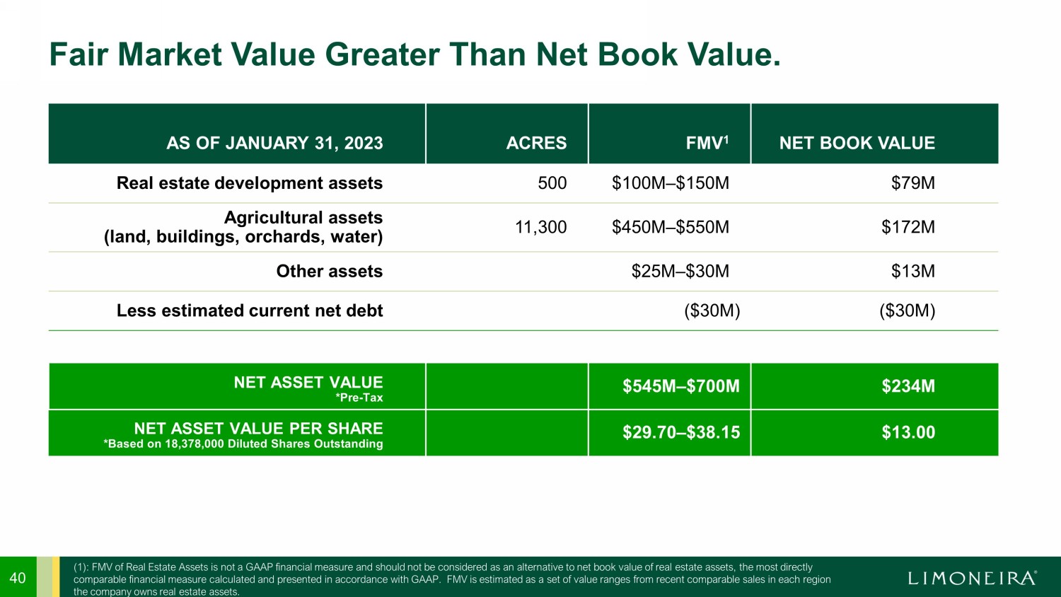 40 Fair Market Value Greater Than Net Book Value. AS OF JANUARY 31, 2023 ACRES FMV 1 NET BOOK VALUE Real estate development assets 500 $100M – $150M $79M Agricultural assets (land, buildings, orchards, water) 11,300 $450M – $550M $172M Other assets $25M – $30M $13M Less estimated current net debt ($30M) ($30M) NET ASSET VALUE *Pre - Tax $545M – $700M $234M NET ASSET VALUE PER SHARE *Based on 18,378,000 Diluted Shares Outstanding $29.70 – $38.15 $13.00 (1): FMV of Real Estate Assets is not a GAAP financial measure and should not be considered as an alternative to net book val ue of real estate assets, the most directly comparable financial measure calculated and presented in accordance with GAAP. FMV is estimated as a set of value ranges fro m r ecent comparable sales in each region the company owns real estate assets.