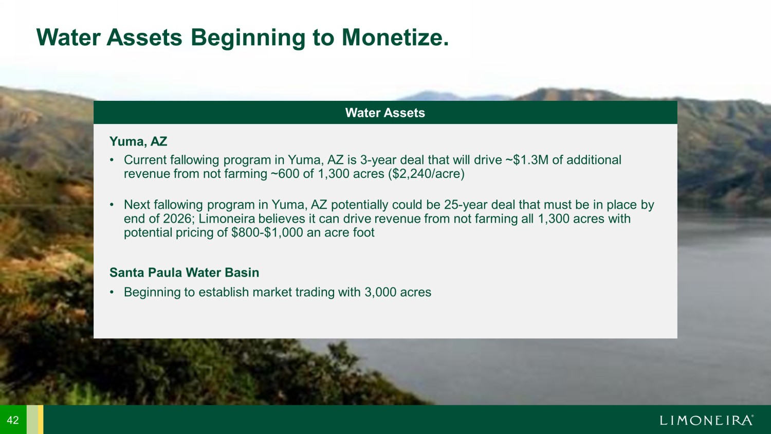 41 Holding Significant Valuation in Ownership Over Water Rights. Water Assets Water rights, usage rights, and water pumping rights associated with Limoneira land ~ 21,000+ ACRE FEET OF OWNED WATER RIGHTS $10k – $40k PER ACRE FOOT Range of recent water rights sales in CA/AZ Substantial investments made in water companies to support and exceed farming needs Colorado River Class 3 Water Rights (12k acre feet) Santa Paula Basin – Adjudicated Pumping Rights (10k+ acre feet) Fillmore Basin – Unadjudicated Pumping Rights Compounded annually since 1974 5.9% SOUTHERN CALIFORNIA WATER PRICE ESCALATION
