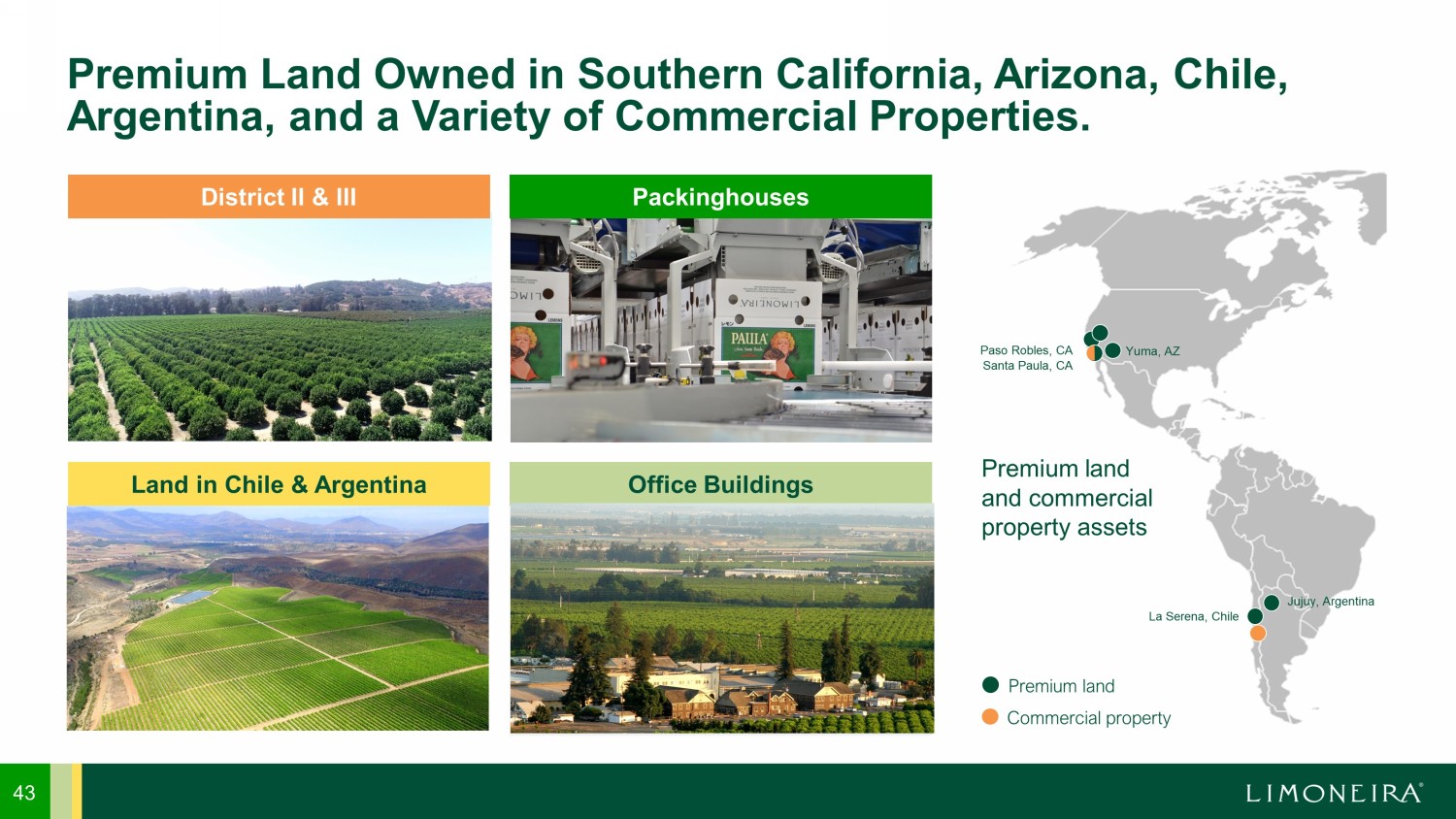 43 Premium Land Owned in Southern California, Arizona, Chile, Argentina, and a Variety of Commercial Properties. Land in Chile & Argentina Office Buildings District II & III Packinghouses Premium land Commercial property Premium land and commercial property assets La Serena, Chile Jujuy, Argentina Paso Robles, CA Santa Paula, CA Yuma, AZ