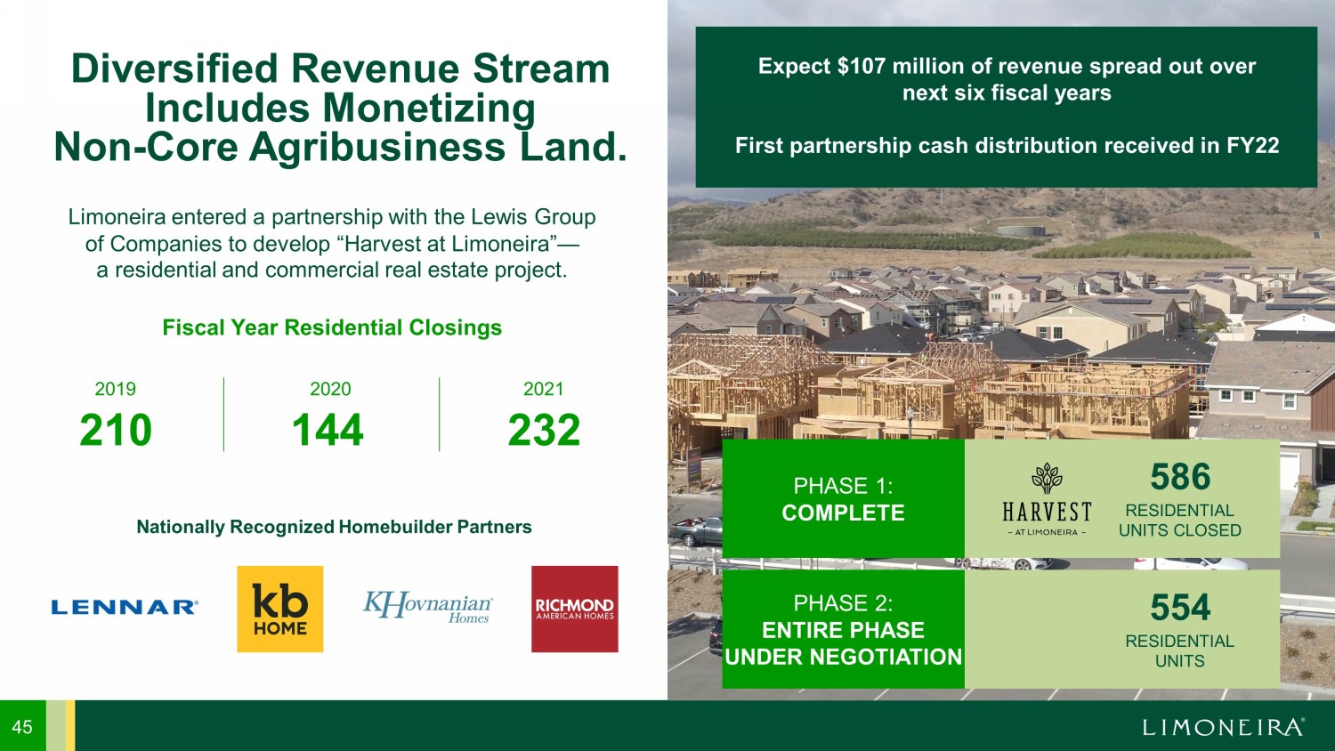 Diversified Revenue Stream Includes Monetizing Non - Core Agribusiness Land. 45 Limoneira entered a partnership with the Lewis Group of Companies to develop “Harvest at Limoneira” — a residential and commercial real estate project. Nationally Recognized Homebuilder Partners Expect $107 million of revenue spread out over next six fiscal years First partnership cash distribution received in FY22 Fiscal Year Residential Closings 210 144 232 2020 2019 2021 586 RESIDENTIAL UNITS CLOSED PHASE 1: COMPLETE 554 RESIDENTIAL UNITS PHASE 2: ENTIRE PHASE UNDER NEGOTIATION