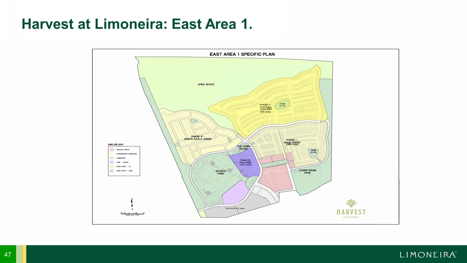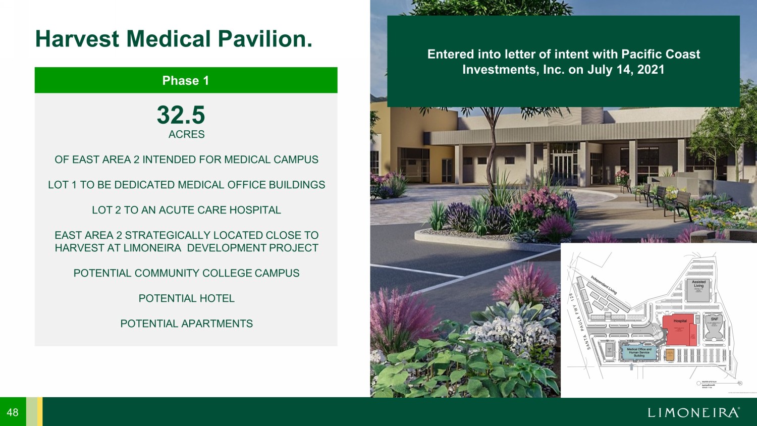 48 Harvest Medical Pavilion. 32.5 ACRES OF EAST AREA 2 INTENDED FOR MEDICAL CAMPUS LOT 1 TO BE DEDICATED MEDICAL OFFICE BUILDINGS LOT 2 TO AN ACUTE CARE HOSPITAL EAST AREA 2 STRATEGICALLY LOCATED CLOSE TO HARVEST AT LIMONEIRA DEVELOPMENT PROJECT POTENTIAL COMMUNITY COLLEGE CAMPUS POTENTIAL HOTEL POTENTIAL APARTMENTS Phase 1 includes Phase 1 Entered into letter of intent with Pacific Coast Investments, Inc. on July 14, 2021