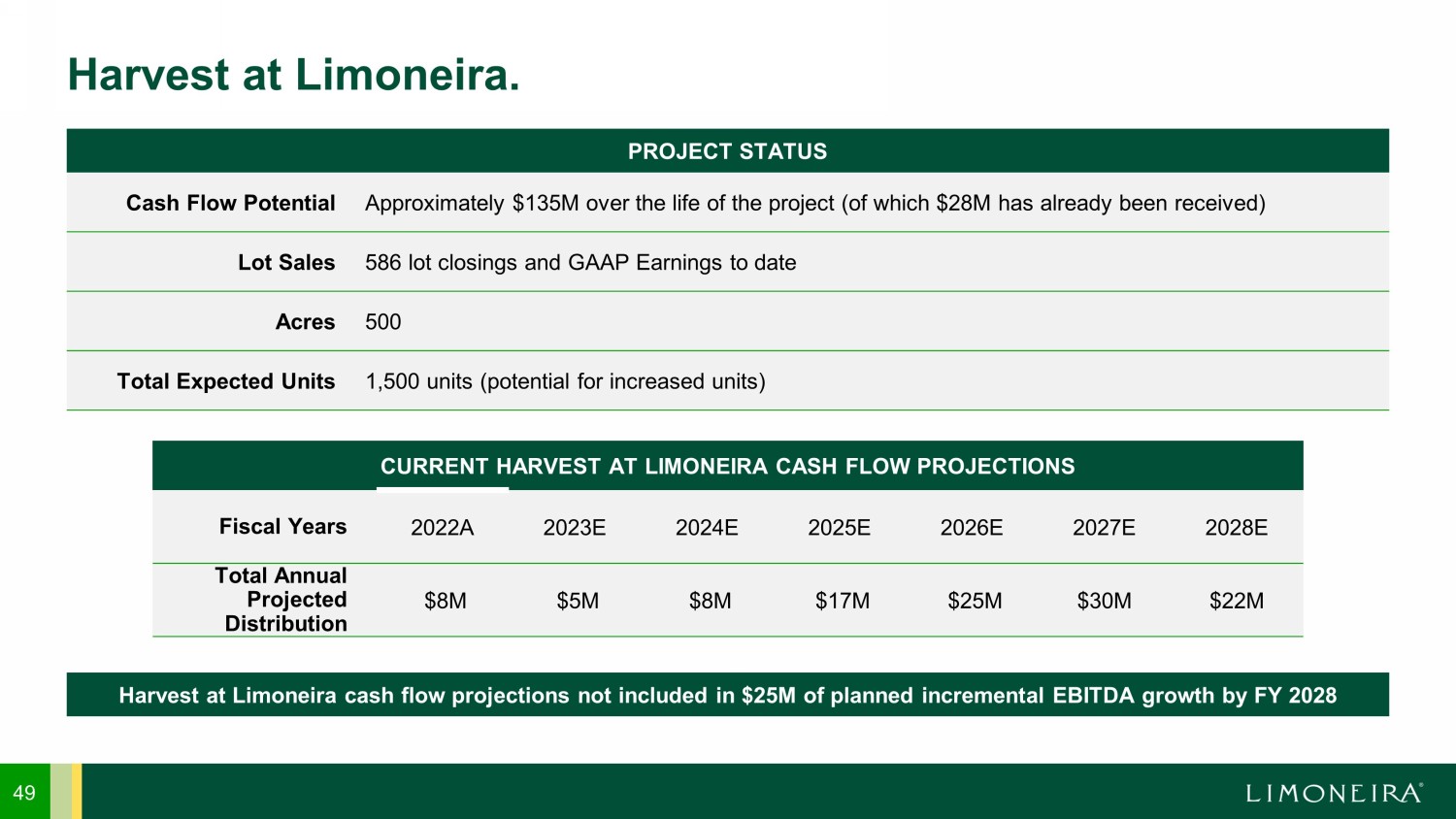 49 Harvest at Limoneira . CURRENT HARVEST AT LIMONEIRA CASH FLOW PROJECTIONS Fiscal Years 2022A 2023E 2024E 2025E 2026E 2027E 2028E Total Annual Projected Distribution $8M $5M $8M $17M $25M $30M $22M PROJECT STATUS Cash Flow Potential Approximately $135M over the life of the project (of which $28M has already been received) Lot Sales 586 lot closings and GAAP Earnings to date Acres 500 Total Expected Units 1,500 units (potential for increased units) Harvest at Limoneira cash flow projections not included in $25M of planned incremental EBITDA growth by FY 2028
