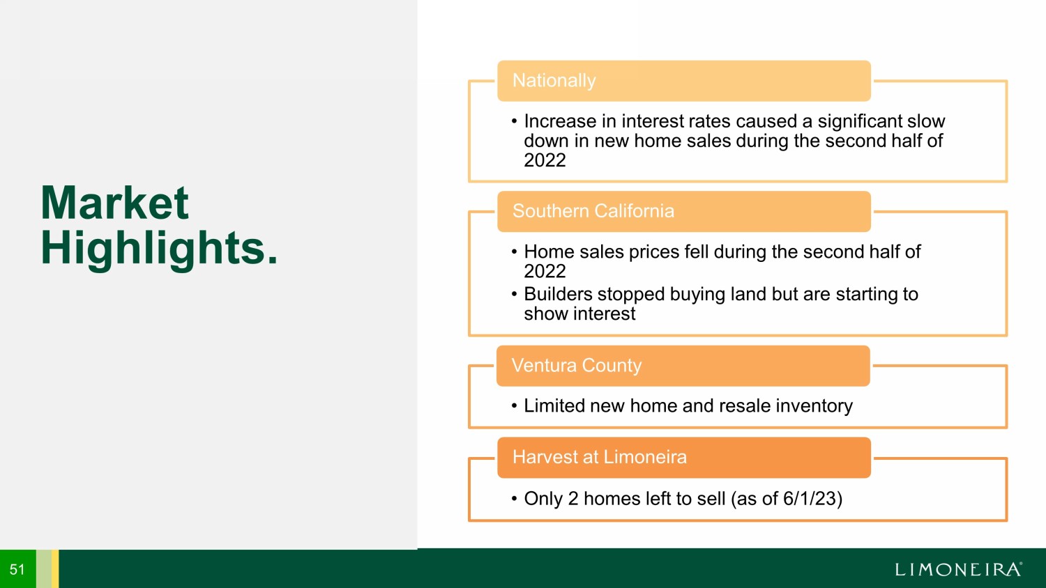 Harvest at Limoneira Community Overview • Currently, the project is approved for 1,500 homesites • 586 homesites have been sold to builders • Builders have sold 579 homes and closed 545 of the homes (as of 3/13/23) Lots/Homes • Complete Phase I of the Sports Park and turn it over to the City for public use • Complete all engineering for Phase II (554 homesites) • Secure entitlements for an additional 550 homesites (300 apartments units and 250 additional homesites in Phase III) • Obtain approvals for 300 - unit apartment project. Approval in include site plan, tentative map, and architectural design 2023 Goals Harvest at Limoneira Community Review. 50