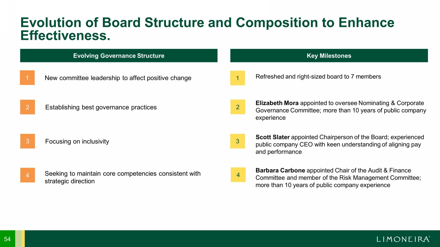 53 Invest in regenerative agricultural practices and continued investment in diversity, equity and inclusion Invest Focus on sustainability, and continued alignment with United Nations Sustainable Development Goals Focus Evolve governance structure and ESG framework Evolve Limoneira’s ISS ESG score improved by 30% year - over - year from an average of 6.6 to 4.6 as of December 2022 Continued Commitment to Improve ESG Scores. Expand Expand relationship with Agromin and biodiversity opportunities