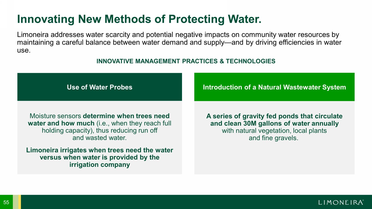 Limoneira addresses water scarcity and potential negative impacts on community water resources by maintaining a careful balance between water demand and supply — and by driving efficiencies in water use. 55 Innovating New Methods of Protecting Water. Moisture sensors determine when trees need water and how much (i.e., when they reach full holding capacity), thus reducing run off and wasted water. Limoneira irrigates when trees need the water versus when water is provided by the irrigation company A series of gravity fed ponds that circulate and clean 30M gallons of water annually with natural vegetation, local plants and fine gravels. Use of Water Probes Introduction of a Natural Wastewater System INNOVATIVE MANAGEMENT PRACTICES & TECHNOLOGIES