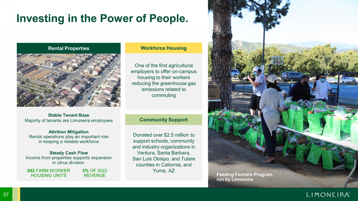 57 Investing in the Power of People. One of the first agricultural employers to offer on - campus housing to their workers reducing the greenhouse gas emissions related to commuting Donated over $2.5 million to support schools, community and industry organizations in Ventura, Santa Barbara, San Luis Obispo, and Tulare counties in Caliornia , and Yuma, AZ Workforce Housing Community Support Rental Properties 242 FARM WORKER HOUSING UNITS 3% OF 2022 REVENUE Stable Tenant Base Majority of tenants are Limoneira employees Attrition Mitigation Rental operations play an important role in keeping a reliable workforce Steady Cash Flow Income from properties supports expansion in citrus division Feeding Farmers Program run by Limoneira