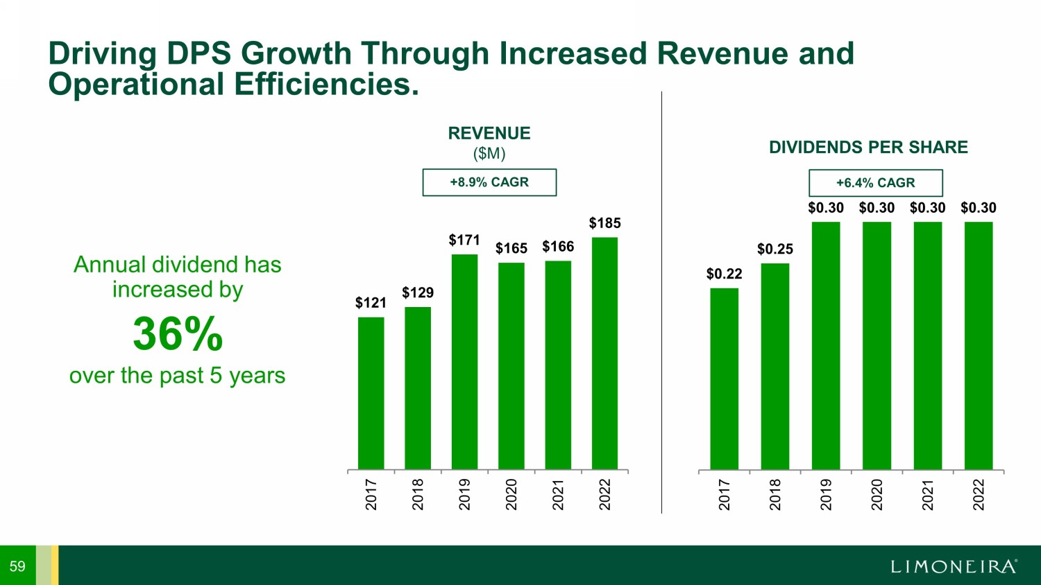 Driving DPS Growth Through Increased Revenue and Operational Efficiencies. $121 $129 $171 $165 $166 $185 2017 2018 2019 2020 2021 2022 REVENUE ($M) $0.22 $0.25 $0.30 $0.30 $0.30 $0.30 2017 2018 2019 2020 2021 2022 DIVIDENDS PER SHARE Annual dividend has increased by over the past 5 years 36% +8.9% CAGR +6.4% CAGR 59