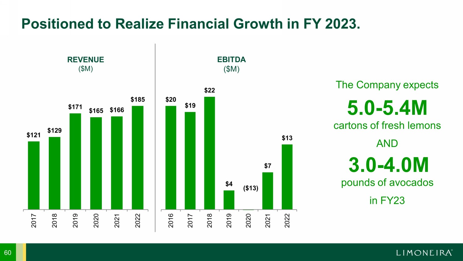 $121 $129 $171 $165 $166 $185 2017 2018 2019 2020 2021 2022 REVENUE ($M) $20 $19 $22 $4 $7 $13 2016 2017 2018 2019 2020 2021 2022 EBITDA ($M) 60 Positioned to Realize Financial Growth in FY 2023. The Company expects cartons of fresh lemons AND pounds of avocados in FY23 5.0 - 5.4M 3.0 - 4.0M ($13)