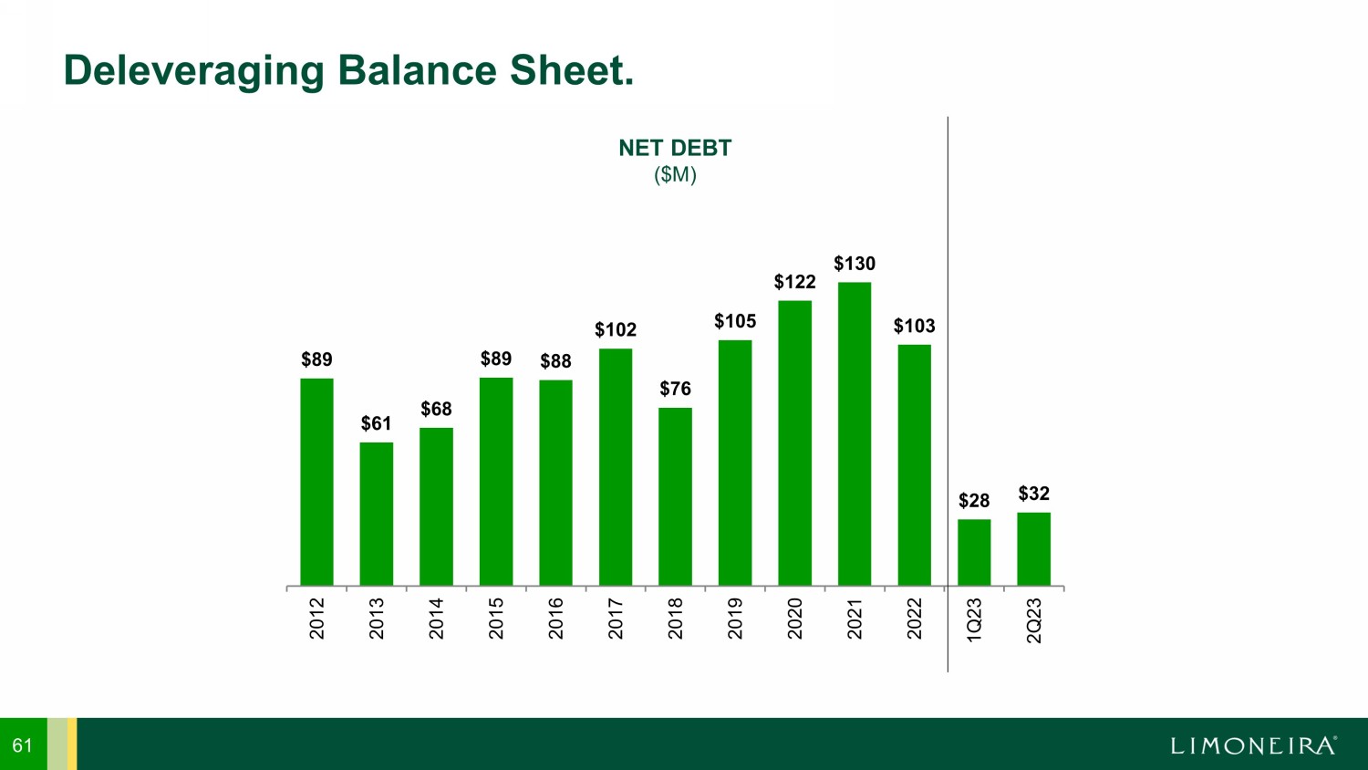 61 Deleveraging Balance Sheet. $89 $61 $68 $89 $88 $102 $76 $105 $122 $130 $103 $28 $32 2012 2013 2014 2015 2016 2017 2018 2019 2020 2021 2022 1Q23 2Q23 NET DEBT ($M)