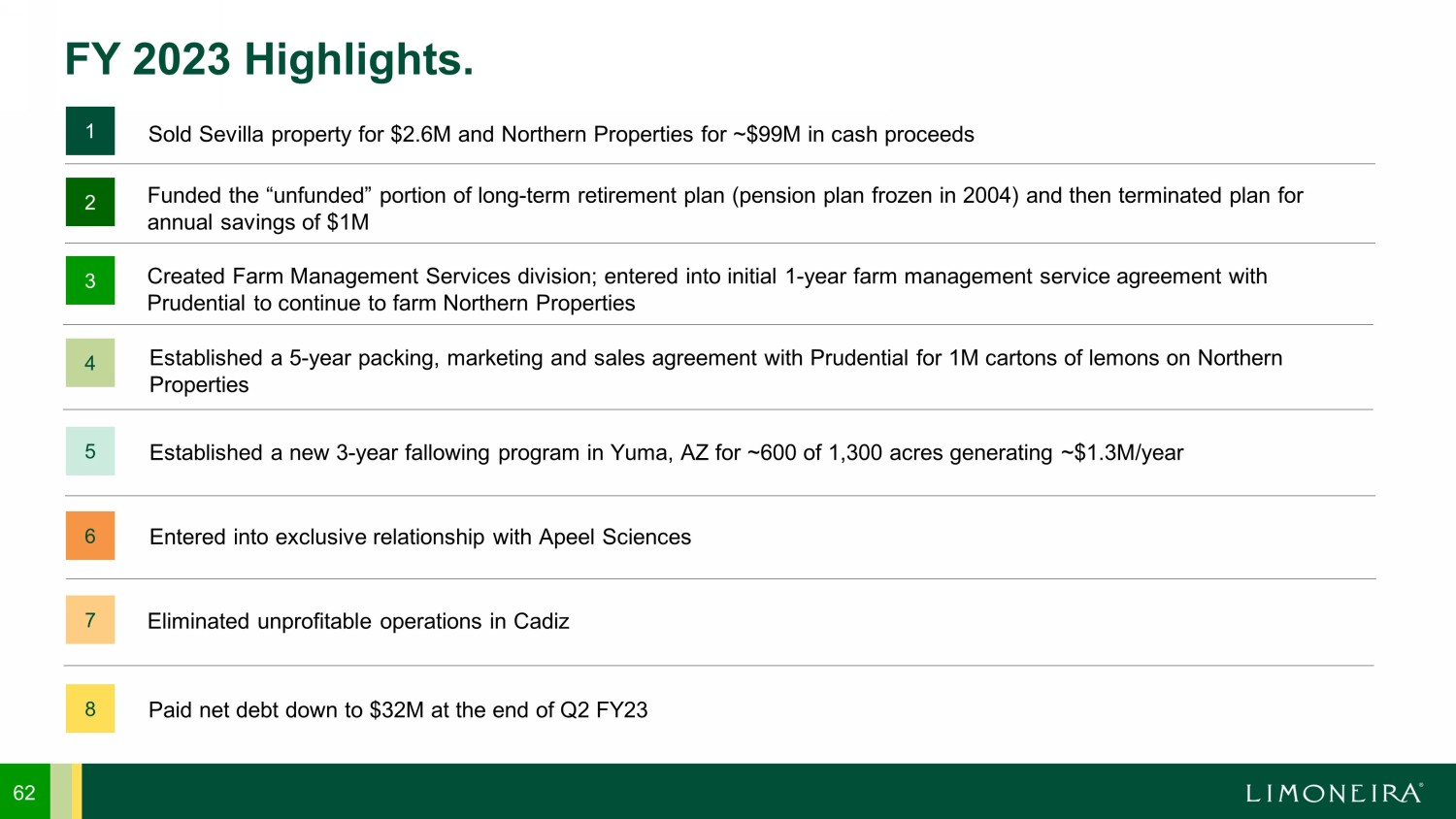 Established a new 3 - year fallowing program in Yuma, AZ for ~600 of 1,300 acres generating ~$1.3M/year 62 FY 2023 Highlights. Established a 5 - year packing, marketing and sales agreement with Prudential for 1M cartons of lemons on Northern Properties Sold Sevilla property for $2.6M and Northern Properties for ~$99M in cash proceeds Created Farm Management Services division; entered into initial 1 - year farm management service agreement with Prudential to continue to farm Northern Properties 1 4 3 5 Funded the “unfunded” portion of long - term retirement plan (pension plan frozen in 2004) and then terminated plan for annual savings of $1M 2 6 Entered into exclusive relationship with Apeel Sciences 7 Eliminated unprofitable operations in Cadiz 8 Paid net debt down to $32M at the end of Q2 FY23