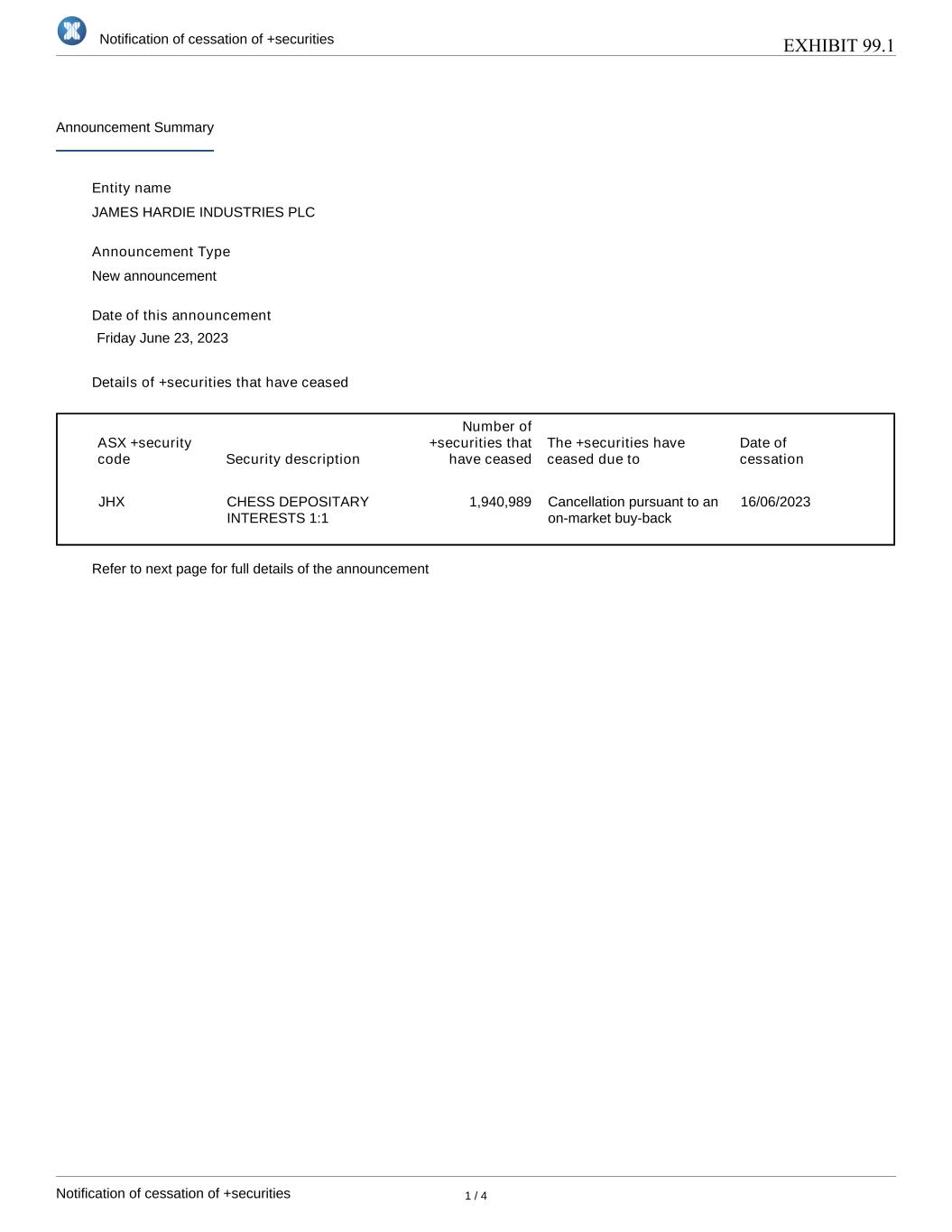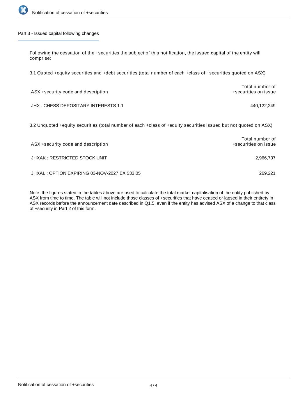 | | Notice of cessation of securities - JHX |