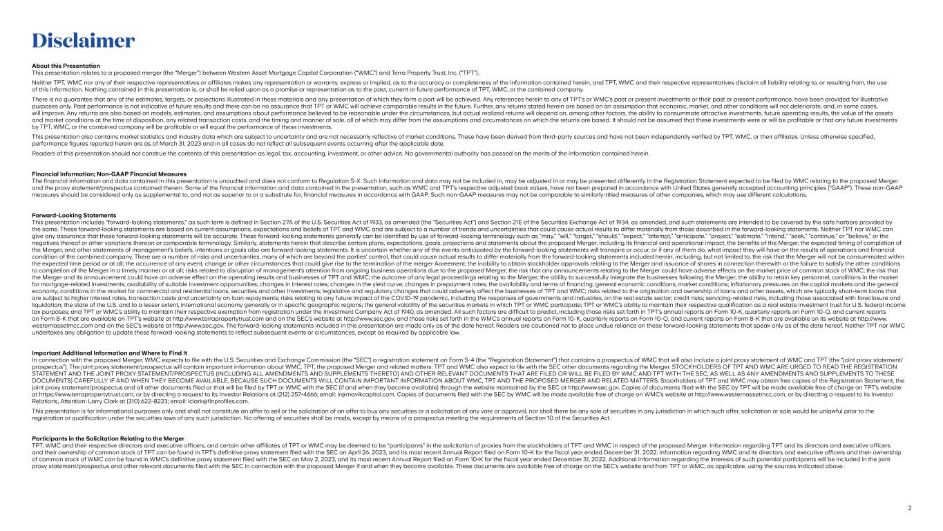 This Current Report on Form 8-K includes “forward-looking statements,” as such term is defined in Section 27A of the Securities Act and Section 21E of the Securities Exchange Act of 1934, as amended, and such statements are intended to be covered by the safe harbor provided by the same. These forward-looking statements are based on current assumptions, expectations and beliefs of WMC and TPT and are subject to a number of trends and uncertainties that could cause actual results to differ materially from those described in the forward-looking statements. Neither WMC nor TPT can give any assurance that these forward-looking statements will be accurate. These forward-looking statements generally can be identified by use of forward-looking terminology such as “may,” “will,” “target,” “should,” “expect,” “attempt,” “anticipate,” “project,” “estimate,” “intend,” “seek,” “continue,” or “believe,” or the negatives thereof or other variations thereon or comparable terminology. Similarly, statements herein that describe certain plans, expectations, goals, projections and statements about the proposed Merger, including its financial and operational impact, the benefits of the Merger, the expected timing of completion of the Merger, and other statements of management’s beliefs, intentions or goals also are forward-looking statements. It is uncertain whether any of the events anticipated by the forward-looking statements will transpire or occur, or if any of them do, what impact they will have on the results of operations and financial condition of the combined company. There are a number of risks and uncertainties, many of which are beyond the parties’ control, that could cause actual results to differ materially from the forward-looking statements included herein, including, but not limited to, the risk that the Merger will not be consummated within the expected time period or at all; the occurrence of any event, change or other circumstances that could give rise to the termination of the Merger Agreement; the inability to obtain stockholder approvals relating the Merger and issuance of shares in connection therewith or the failure to satisfy the other conditions to completion of the Merger in a timely manner or at all; risks related to disruption of management’s attention from ongoing business operations due to the proposed Merger; the risk that any announcements relating to the Merger could have adverse effects on the market price of common stock of WMC; the risk that the Merger and its announcement could have an adverse effect on the operating results and businesses of WMC and TPT; the outcome of any legal proceedings relating to the Merger; the ability to successfully integrate the businesses following the Merger; the ability to retain key personnel; conditions in the market for mortgage-related investments; availability of suitable investment opportunities; changes in interest rates; changes in the yield curve; changes in prepayment rates; the availability and terms of financing; general economic conditions; market conditions; inflationary pressures on the capital markets and the general economy; conditions in the market for commercial and residential loans, securities and other investments; legislative and regulatory changes that could adversely affect the businesses of WMC or TPT; risks related to the origination and ownership of loans and other assets, which are typically short-term loans that are subject to higher interest rates, transaction costs and uncertainty on loan repayments; risks relating to any future impact of the COVID-19 pandemic, including the responses of governments and industries, on the real estate sector; credit risks; servicing-related risks, including those associated with foreclosure and liquidation; the state of the U.S. and to a lesser extent, international economy generally or in specific geographic regions; the general volatility of the securities markets in which WMC or TPT participate; WMC or TPT’s ability to maintain their respective qualification as a real estate investment trust for U.S. federal income tax purposes; and WMC or TPT’s ability to maintain their respective exemption from registration under the Investment Company Act of 1940, as amended. All such factors are difficult to predict, including those risks set forth in the WMC’s annual reports on Form 10-K, quarterly reports on Form 10-Q, and current reports on Form 8-K that are available on its website at http://www.westernassetmcc.com and on the SEC’s website at http://www.sec.gov, and those risks set forth in TPT’s annual reports on Form 10-K, quarterly reports on Form 10-Q, and current reports on Form 8-K that are available on TPT’s website at http://www.terrapropertytrust.com and on the SEC’s website at http://www.sec.gov. The forward-looking statements included in this Current Report on Form 8-K are made only as of the date hereof. Readers are cautioned not to place undue reliance on these forward-looking statements that speak only as of the date hereof. Neither WMC nor TPT undertakes any obligation to update these forward-looking statements to reflect subsequent events or circumstances, except as required by applicable law.